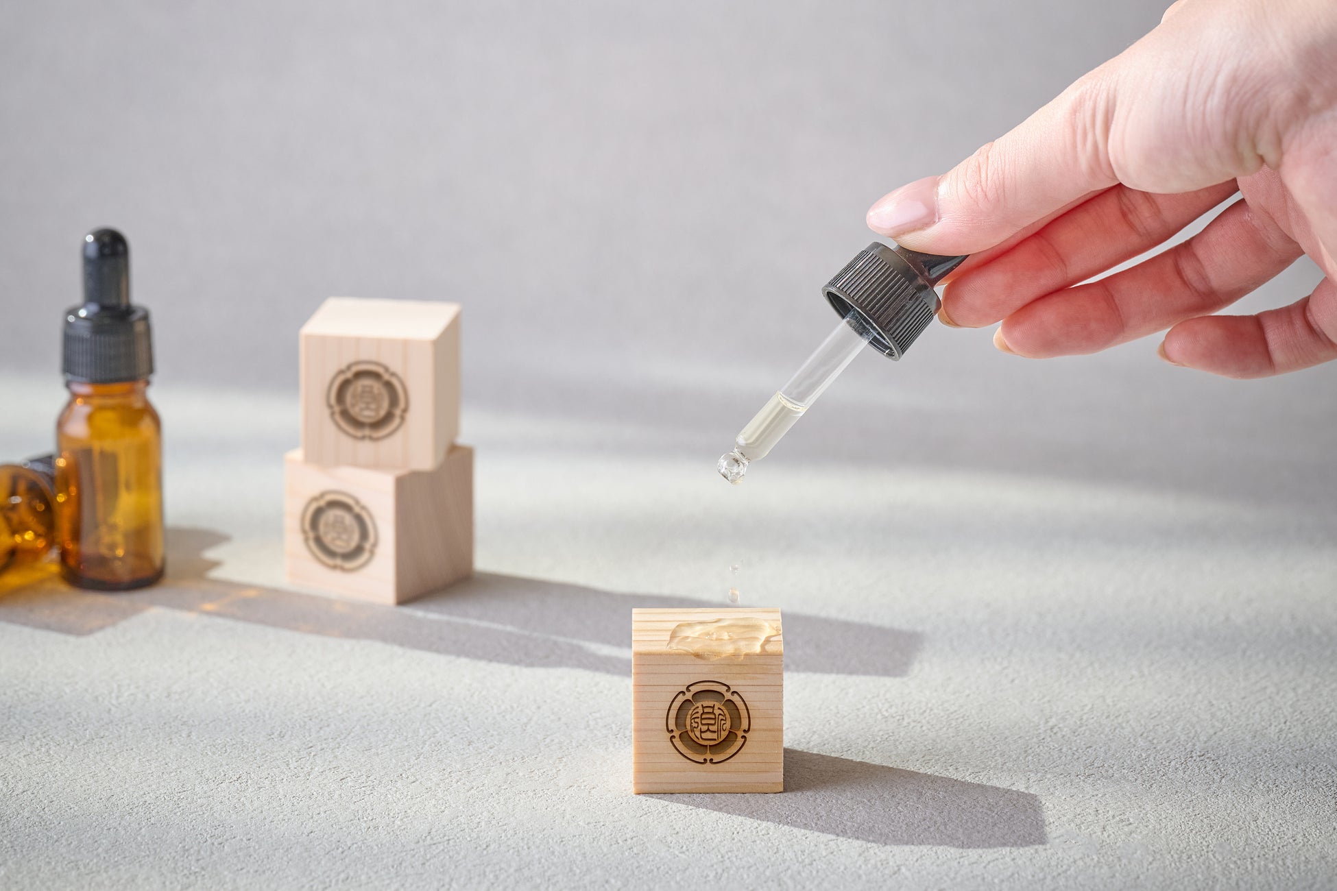 岐阜県産の自然素材の精油を使い、刻印入りのアロマウッドにお好みの香りを染み込ませます。枕元やテーブルのそばに置くだけで木のぬくもりと香りがやさしく広がり、心がふっとほどけるような癒しの時間に。「アスナロ木×レモン」は心身をリフレッシュさせる香り、「ヒノキ×ユズ」は心を穏やかにしながら気分を明るくする香りなど、お気に入りの香りの調合を愉しめます。