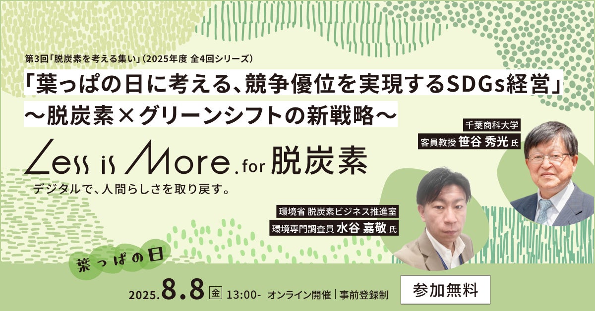 「Less is More. for 脱炭素」第3回目となる今回は、8月8日(金)の「葉っぱの日」に、持続可能な成長と競争優位を両立する経営戦略を考えるためのオンラインイベントを開催します。