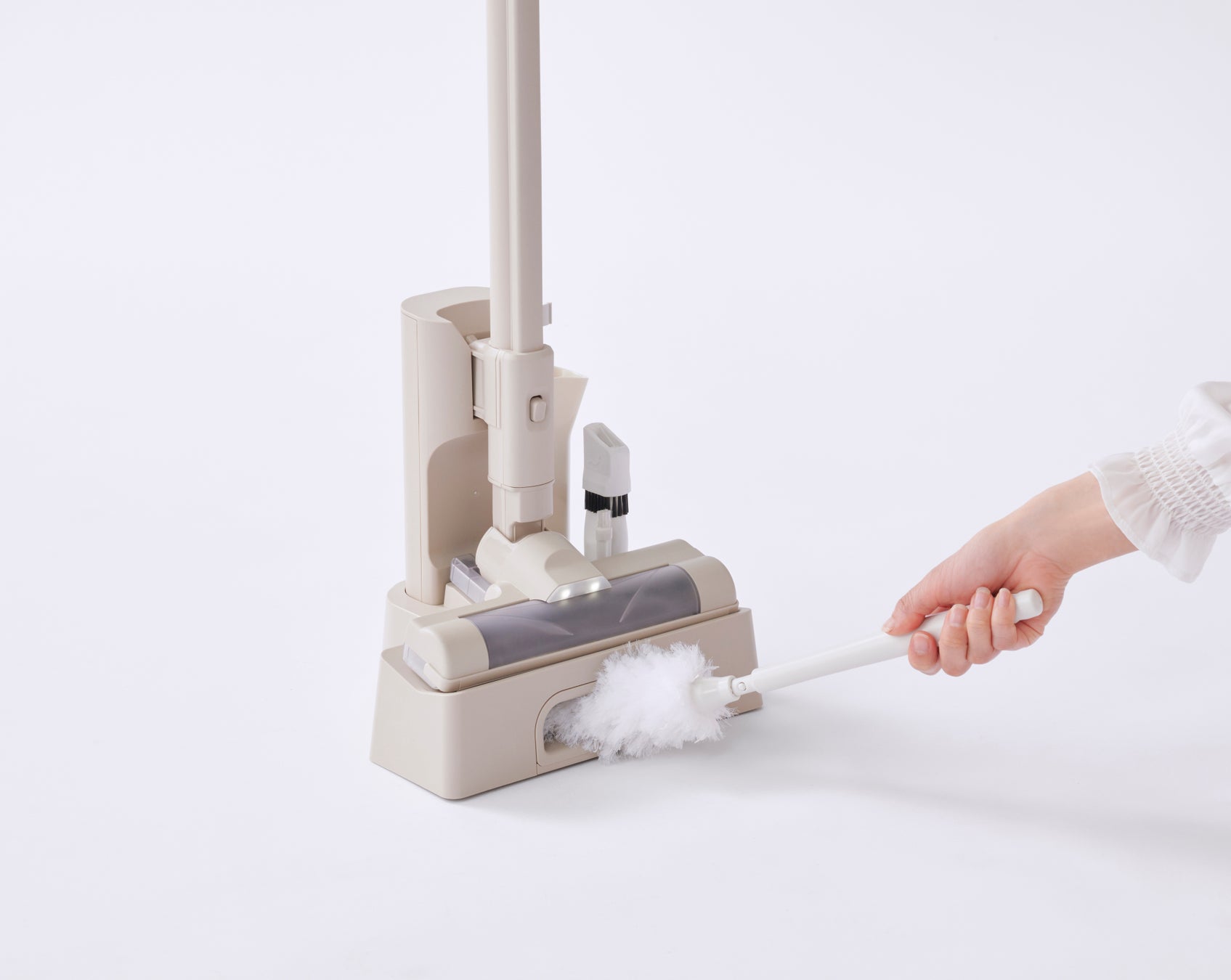 製品質量が約1.1kg(※3)と、従来品比最軽量(※4)のスティッククリーナーです。小型で高性能なモーターを搭載し、軽量ながら強力な吸引力を実現しています。LEDライト搭載の小型ヘッドは狭い場所でも取り回しが容易なほか、ほこり感知センサーによりゴミの量を感知し吸引力を自動調整できます。充電スタンドには当社独自の静電モップクリーンシステムを備え、棚上のほこりなどを床と同時に効率よく掃除できます。静電モップは水洗い可能で繰り返し使用できます。