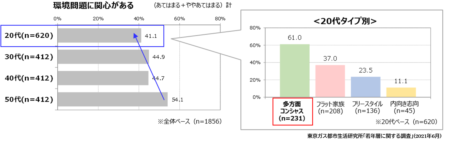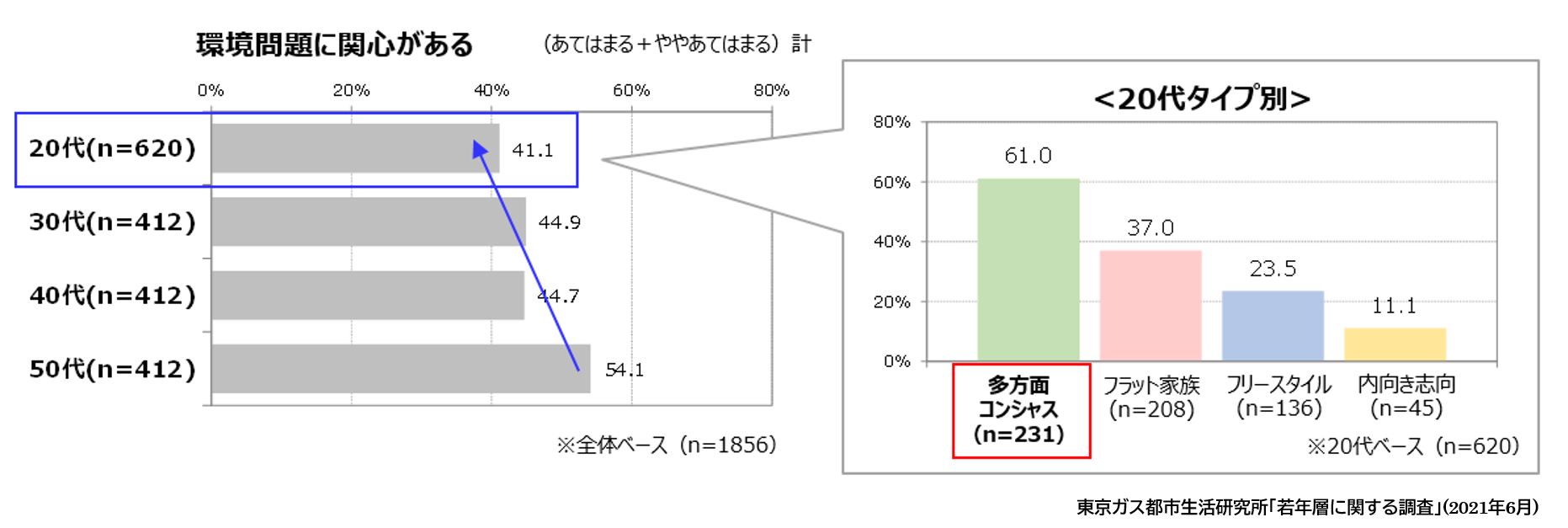 ただし、20代をタイプ別に見ると、「多方面コンシャス」タイプでは、環境問題に関心がある割合が60%以上であることがわかりました。