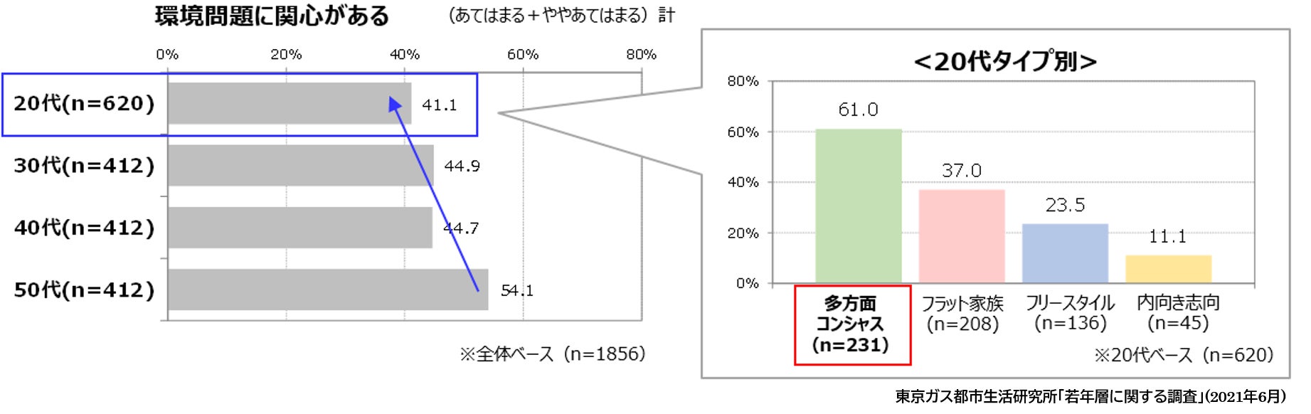 ※東京ガス都市生活研究所の調査により、10代の環境への関心は20~50代よりも高いことが明らかになっています。