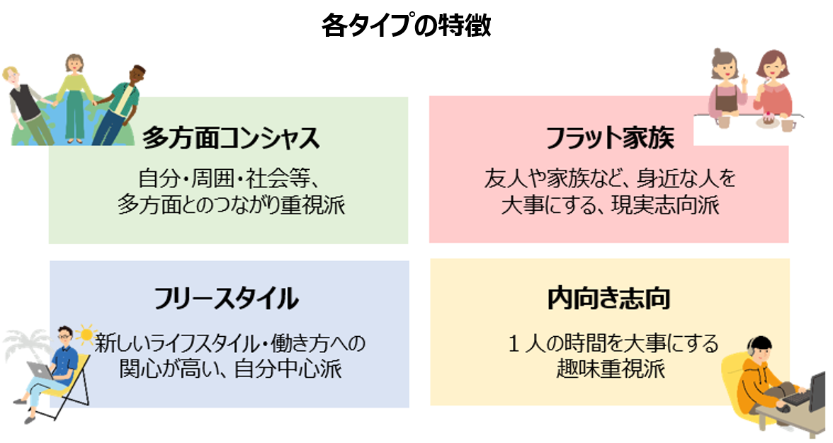 同研究所では、「若年層に関する調査」を実施し、つながり意識・価値観・生活意識を分析、その結果から20代を「多方面コンシャス」「フラット家族」「フリースタイル」「内向き志向」の4つのタイプに分類しました。