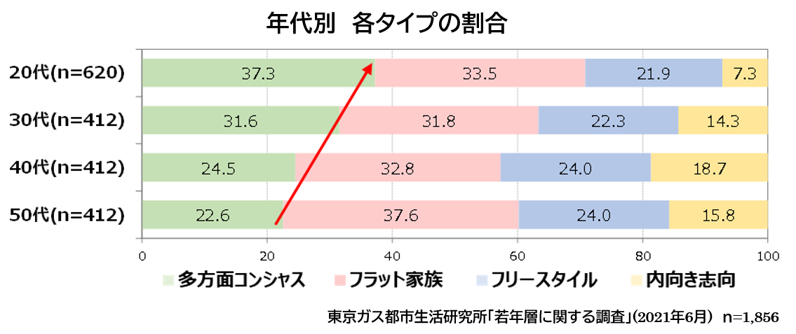 年代で比較してみると、若い年代ほど「多方面コンシャス」タイプが多く「内向き志向」タイプが少ないことがわかりました。