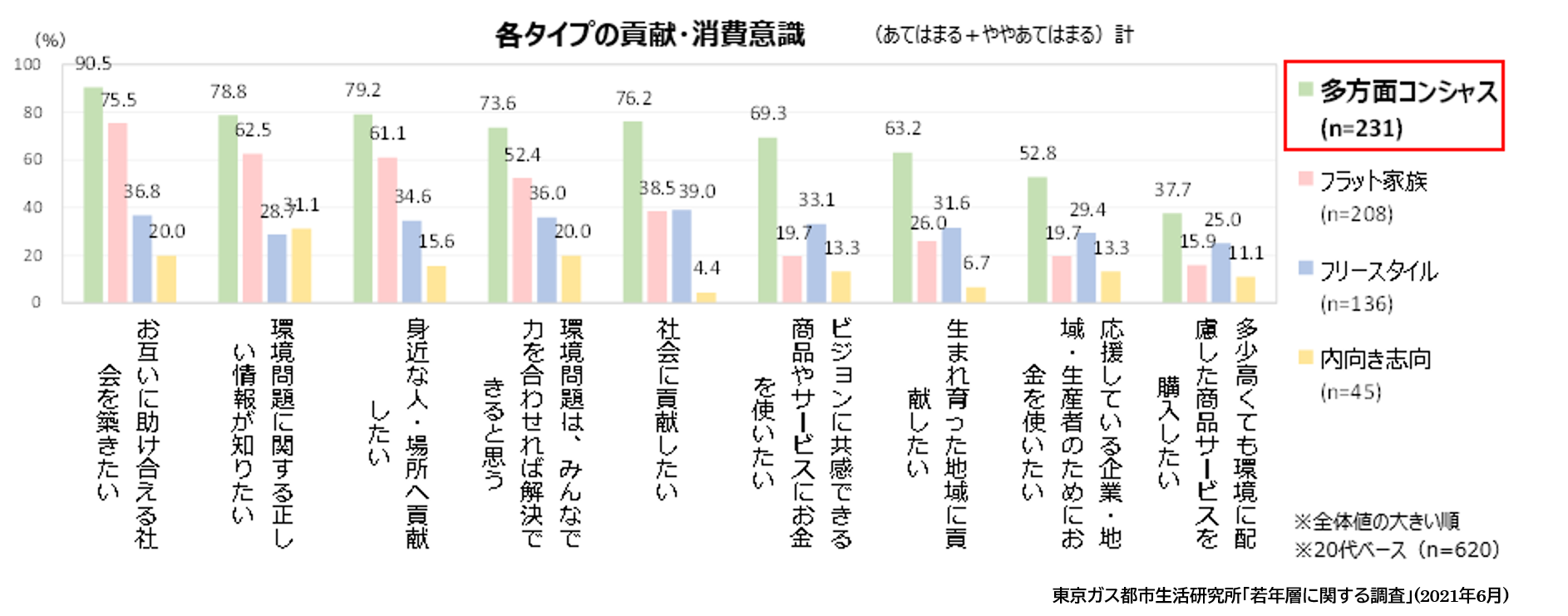 消費を通じて応援・貢献したいという意識も高いため、「多方面コンシャス」タイプにとって「ビジョンに共感できるかどうか」「応援したいかどうか」は、消費活動をする上で重要なポイントになります。