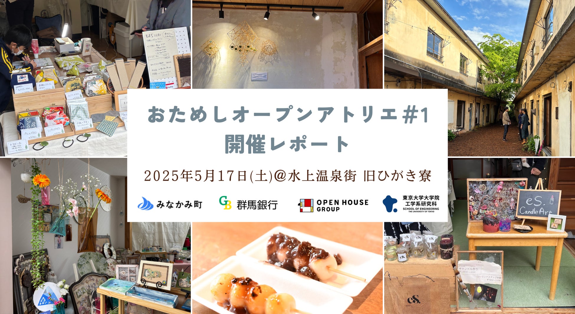 株式会社オープンハウスグループ(本社 東京都千代田区、代表取締役社長 荒井正昭、以下「当社」)は、2021年9⽉に群馬県みなかみ町、群⾺銀⾏、東京⼤学大学院工学系研究科(以下「東京大学」)と締結した「産官学⾦包括連携協定」(以下「本協定」)に基づき進めております「⽔上温泉街再⽣プロジェクト」の⼀環として、2025年5⽉17⽇(土)に開催された「おためしオープンアトリエ#1」に協力いたしました。