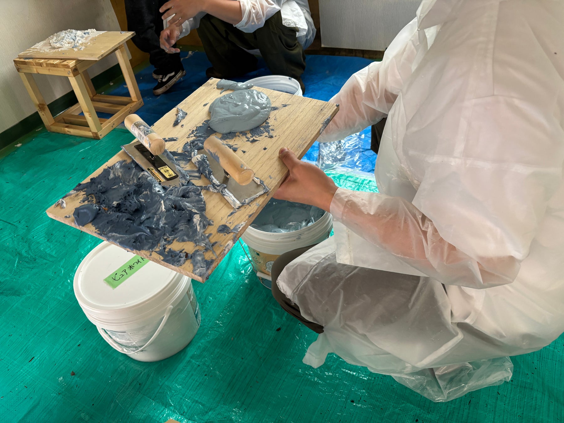 ・ワークショップ(旧ひがき寮の一室の壁に塗装を行う、漆喰風塗料を用いた左官体験)
