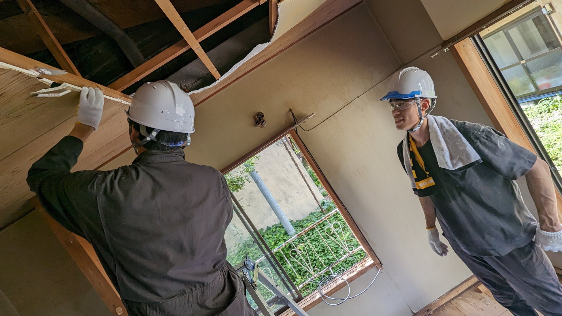 今回の「おためしオープンアトリエ#1」開催にあたっては、電気工事の資格を保有する当社社員が、東大生の皆様と協力。照明やコンセントの設置などを行い、これまで電気が通っていなかった旧ひがき寮に明かりが灯りました。