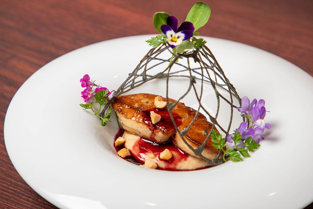 沖縄の郷土料理のジーマーミ(ピーナッツ)豆腐とフォアグラを合わせたフュージョン料理。もっちりとしたジーマーミ豆腐と、表面を香ばしくポワレしたフォアグラの食感と味わいをお楽しみください。ローストした落花生の食感がアクセントに。