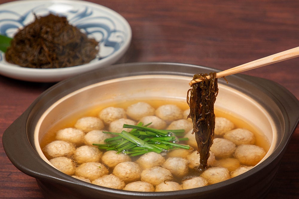 魚と鶏からとったさっぱりしたスープで、太くてコシのあるもずくを ‘しゃぶしゃぶ’ して、鶏だんごとともにご賞味ください。