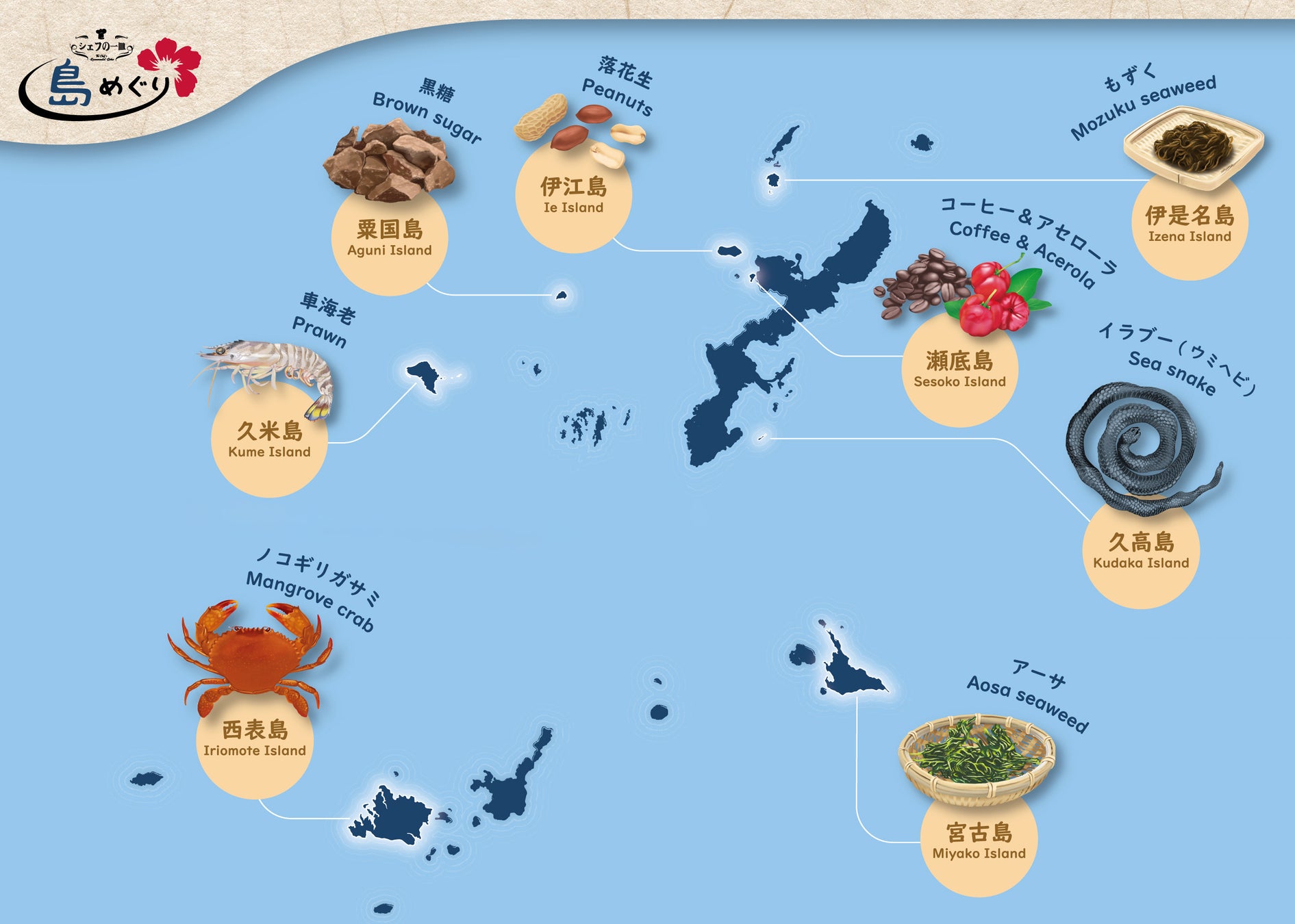 落花生(伊江島)、イラブー(ウミヘビ・久高島)、コーヒー&アセローラ(瀬底島)、車海老(久米島)、黒糖(粟国島)、アーサ(宮古島)、ノコギリガサミ(西表島)、もずく(伊是名島)を使った食材の魅力を伝える8品の料理で、沖縄の島めぐりをお楽しみください。