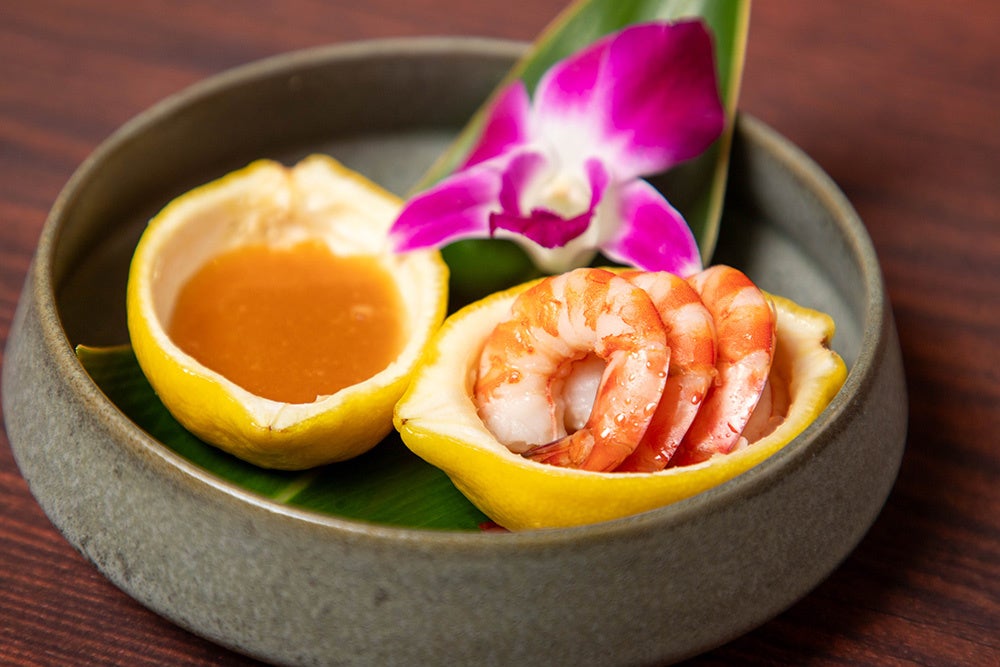 久米島の海洋深層水で育てられた車海老は、甘みと旨味が凝縮。さっと塩ゆでした車海老を爽やかなレモンのディップでお楽しみください。