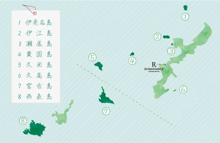 伊是名島、伊江島、瀬底島、粟国島、久米島、久高島、宮古島、西表島