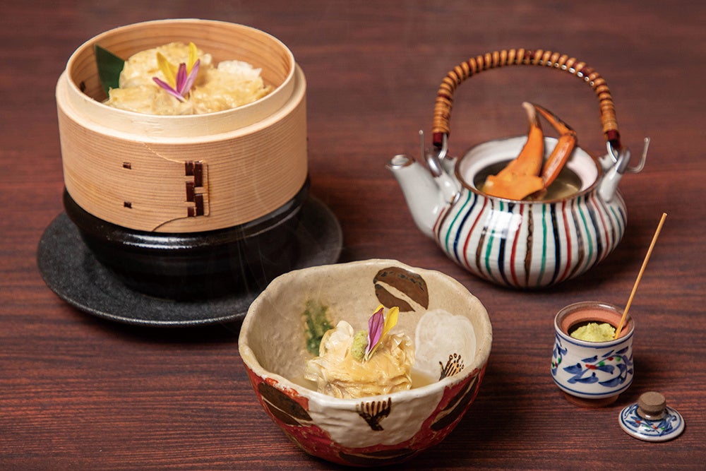 ノコギリガサミとはマングローブに生息するカニ。濃厚な旨味のカニの身を使った萩真丈を湯葉で包み、蒸し上げました。カニ餡と山葵でどうぞ。