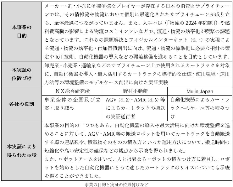 株式会社NX総合研究所(代表取締役社長:鈴木 理仁)、野村不動産株式会社(代表取締役社長:松尾 大作)、株式会社 Mujin Japan(取締役 CEO:荒瀬 勇)は、近年課題となっている労働力不足への対応等に対する取り組みである経済産業省委託事業「令和6年度流通・物流の効率化・付加価値創出に係る基盤構築事業(物流施設の自動化に資するカートラックのモデルケース創出)」(以下「本事業」)において、 卸売業・小売業・運輸業などのサプライチェーン上で使用されるカートラックを対象に、自動化機器を導入・最大活用するカートラックの標準的な仕様・使用環境・運用方法等の環境整備のモデルケース創出に向けて、実証実験(以下「本実証」)を行いました。