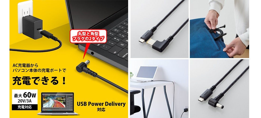 かさばるノートパソコンのACアダプターがコンパクトに!USB-Cポート搭載のUSB AC充電器から丸型や角型プラグに接続できる変換ケーブルを新発売