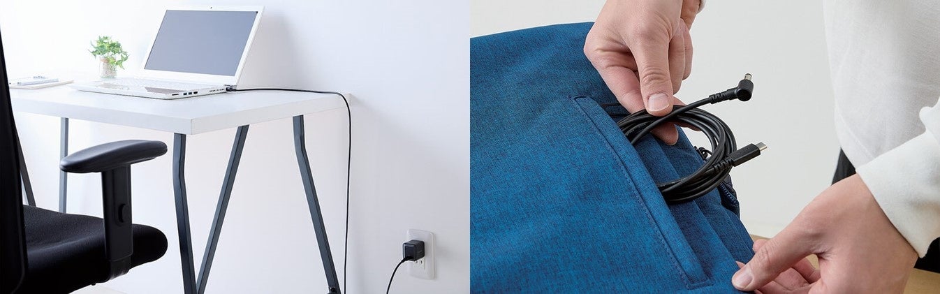 本製品は、ノートパソコン側の電源入力ポートが丸型や角型であっても、別途ご用意いただいたUSB Power Deliveryに対応するAC充電器を使って、軽量でコンパクトな電源環境を作ることができる変換ケーブルです(※)。