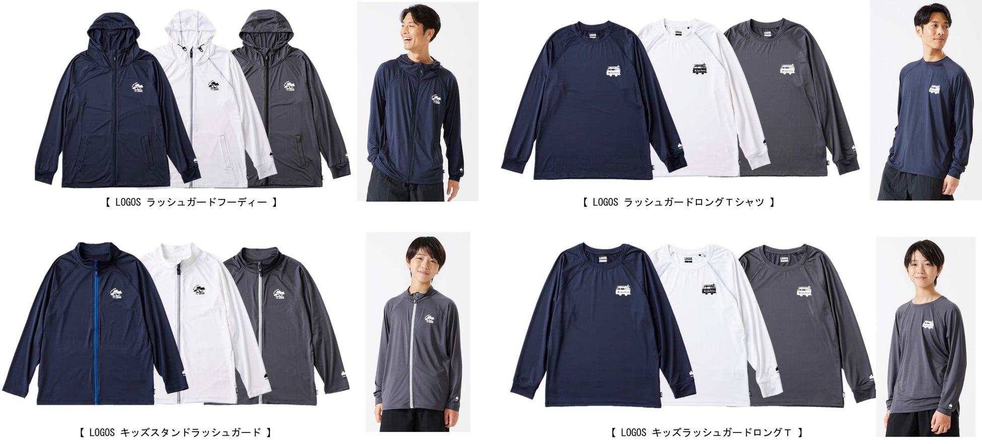 大人用はフード付きでファスナータイプの「ラッシュガードフーディ」、UネックでロンTタイプの「ロングTシャツ」をラインアップし、キッズ用はファスナータイプの「キッズスタンドラッシュガード」、UネックでロンTタイプの「キッズラッシュガードロングT」をラインアップします。
