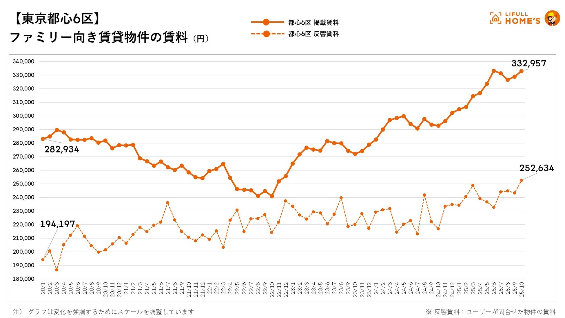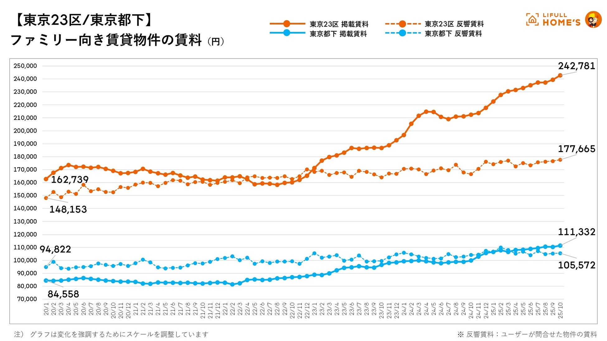 2025年10月の東京都のファミリー向き賃貸物件の平均掲載賃料は、23区で242,781円(前年同月比114.3%)と2021年1月以降の過去最高賃料を更新し、初めて24万円超えとなりました。東京都下も111,332円(前年同月比111.5%)と過去最高賃料を更新し、東京都内全体のファミリー向き物件の掲載賃料が上昇しています。