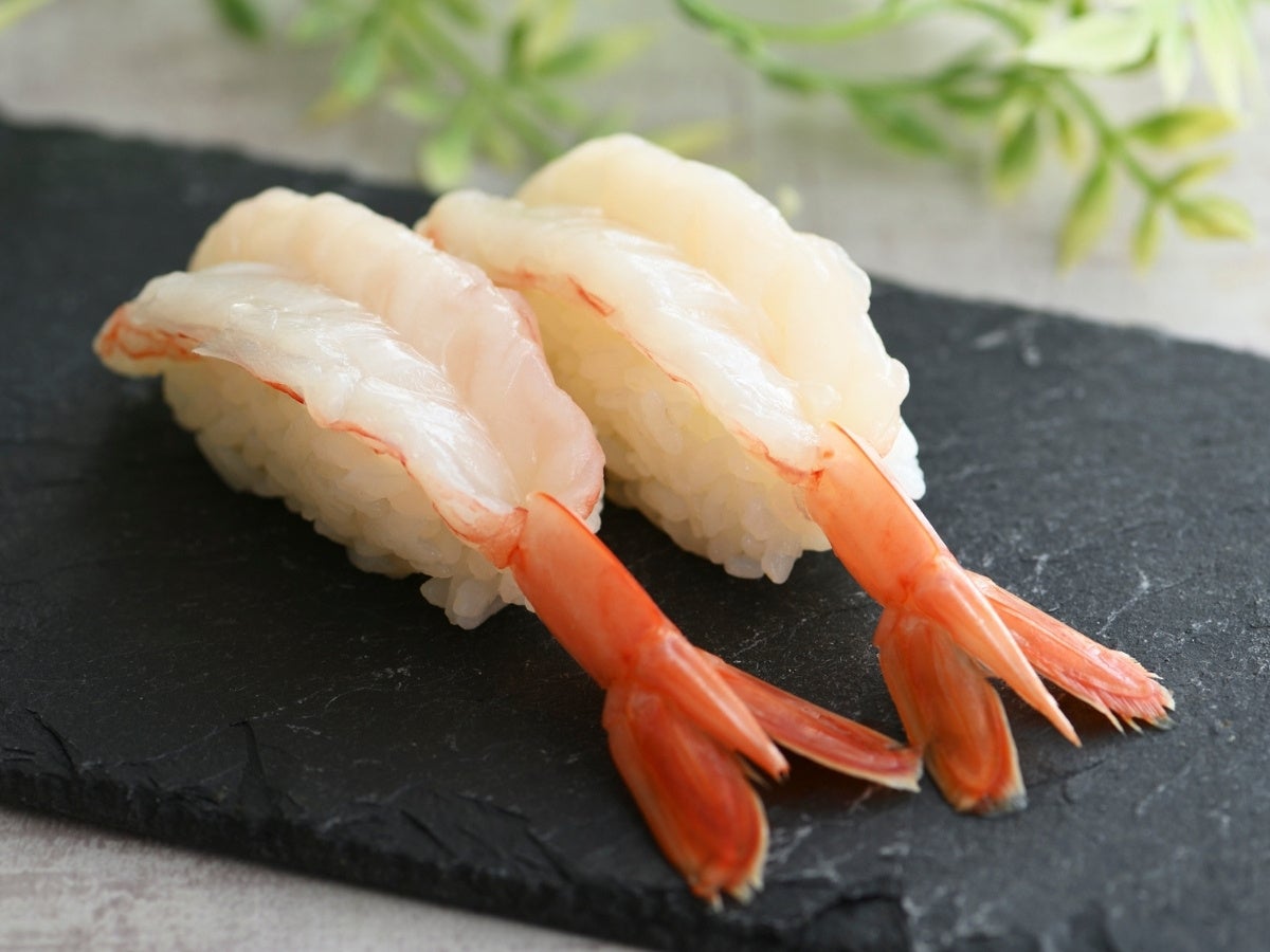 口の中で広がる甘みとプリプリ食感がたまらない『生海老寿司』。