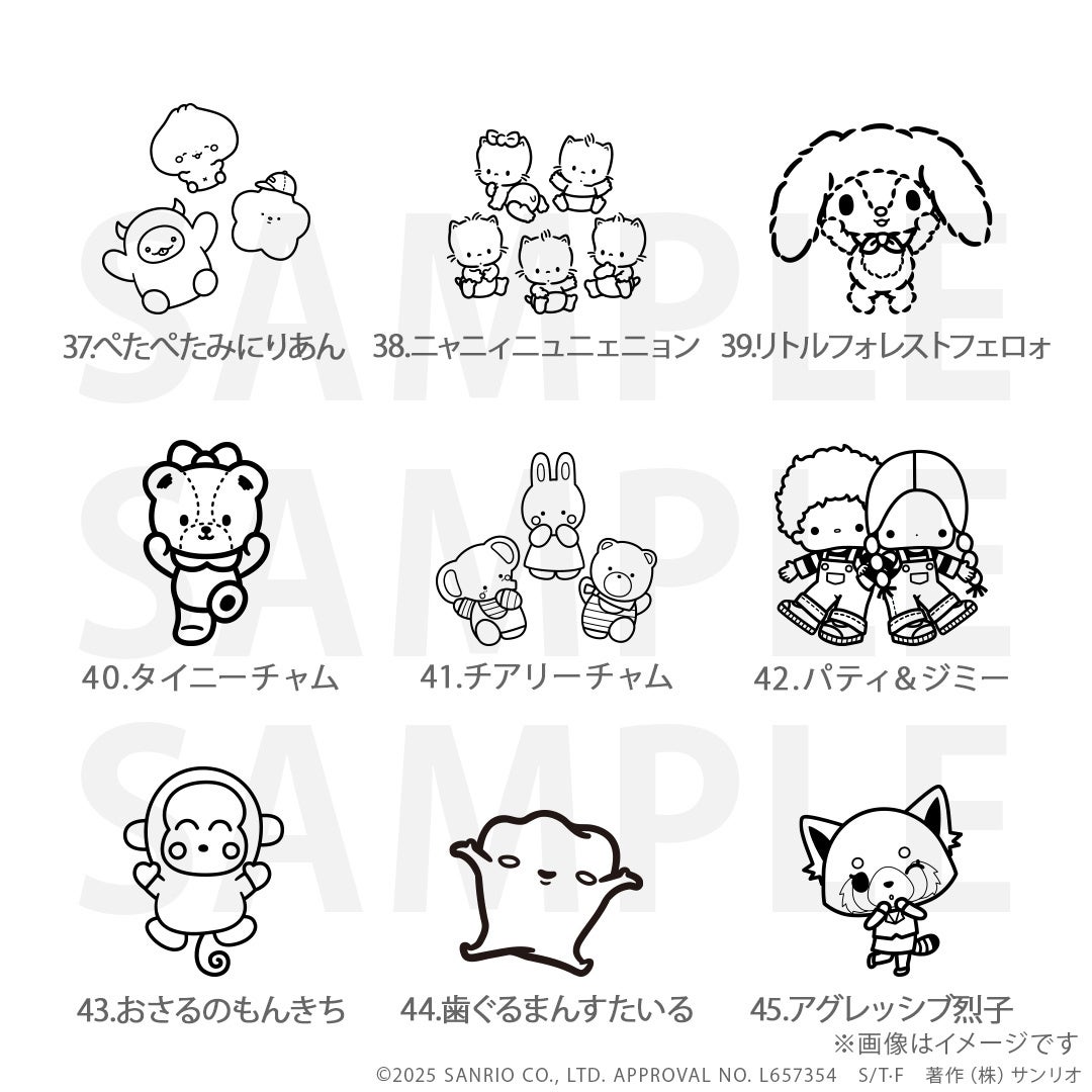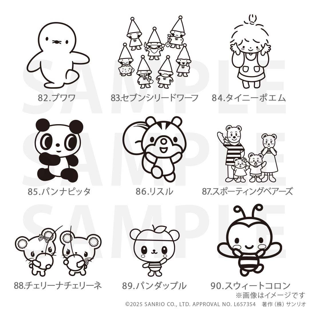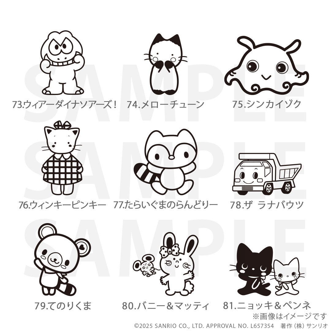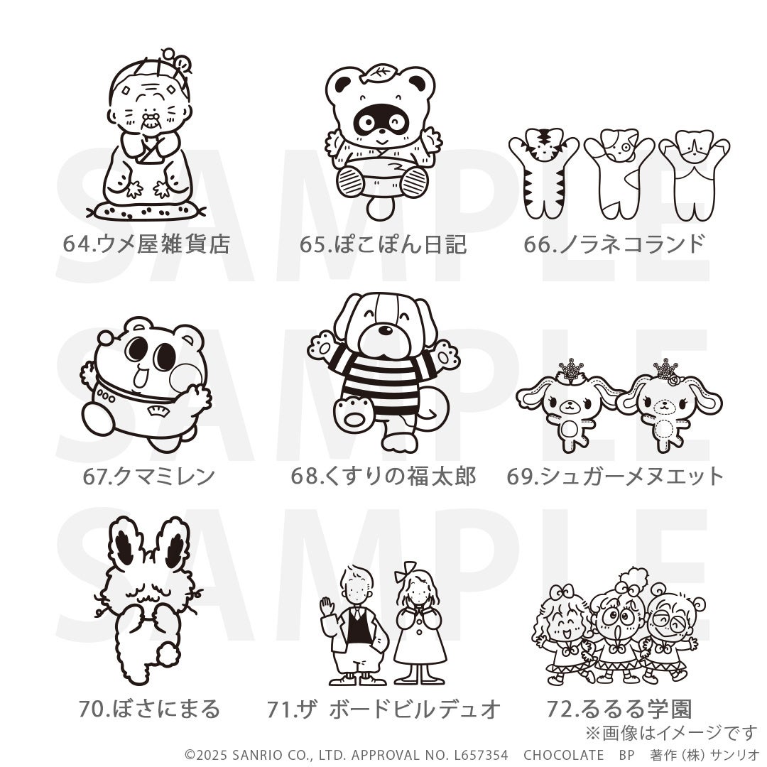 ナモロール、ポチャッコ、クロミ、ポムポムプリン、ハローキティ、マイメロディ、けろけろけろっぴ、ハンギョドン、タキシードサム、リトルツインスターズ、あひるのペックル、こぎみゅん、バッドばつ丸、はなまるおばけ、ウィッシュミーメル、ぐでたま、マイスウィートピアノ、KIRIMIちゃん.、コロコロクリリン、ウサハナ、がおぱわるぅ、SHOW BY ROCK!!、まるもふびより、マロンクリーム、かぶきにゃんたろう、yoshikitty、みんなのたあ坊、ディアダニエル、チャーミーキティ、ぽっきょくてん、ぼんぼんりぼん、ルロロマニック、ハローミミィ、シュガーバニーズ、まいまいまいごえん、ジュエルペット、ぺたぺたみにりあん、ニャニィニュニェニョン、リトルフォレストフェロォ、タイニーチャム、チアリーチャム、パティ&ジミー、おさるのもんきち、歯ぐるまんすたいる、アグレッシブ烈子、チョコキャット、ゴロピカドン、アドローザトルマリィ、パタパタペッピー、ミュークルドリーミー、BUDDYEDDY、マシュマロみたいなふわふわにゃんこ、イチゴマン、ビートキャッツ、かしわんこもち、パウピポ、フレッシュパンチ、リルリルフェアリル、いちごの王さま、ザシキブタ、ハミングミント、カリバディクス、ぱんくんち、ウメ屋雑貨店、ぽこぽん日記、ノラネコランド、クマミレン、くすりの福太郎、シュガーメヌエット、ぼさにまる、ザ ボードビルデュオ、るるる学園、ウィアーダイナソアーズ!、メローチューン、シンカイゾク、ウィンキーピンキー、たらいぐまのらんどりー、ザ ラナバウツ、てのりくま、バニー&マッティ、ニョッキ&ペンネ、プワワ、セブンシリードワーフ、タイニーポエム、パンナピッタ、リスル、スポーティングベアーズ、チェリーナチェリーネ、パンダップル、スウィートコロン