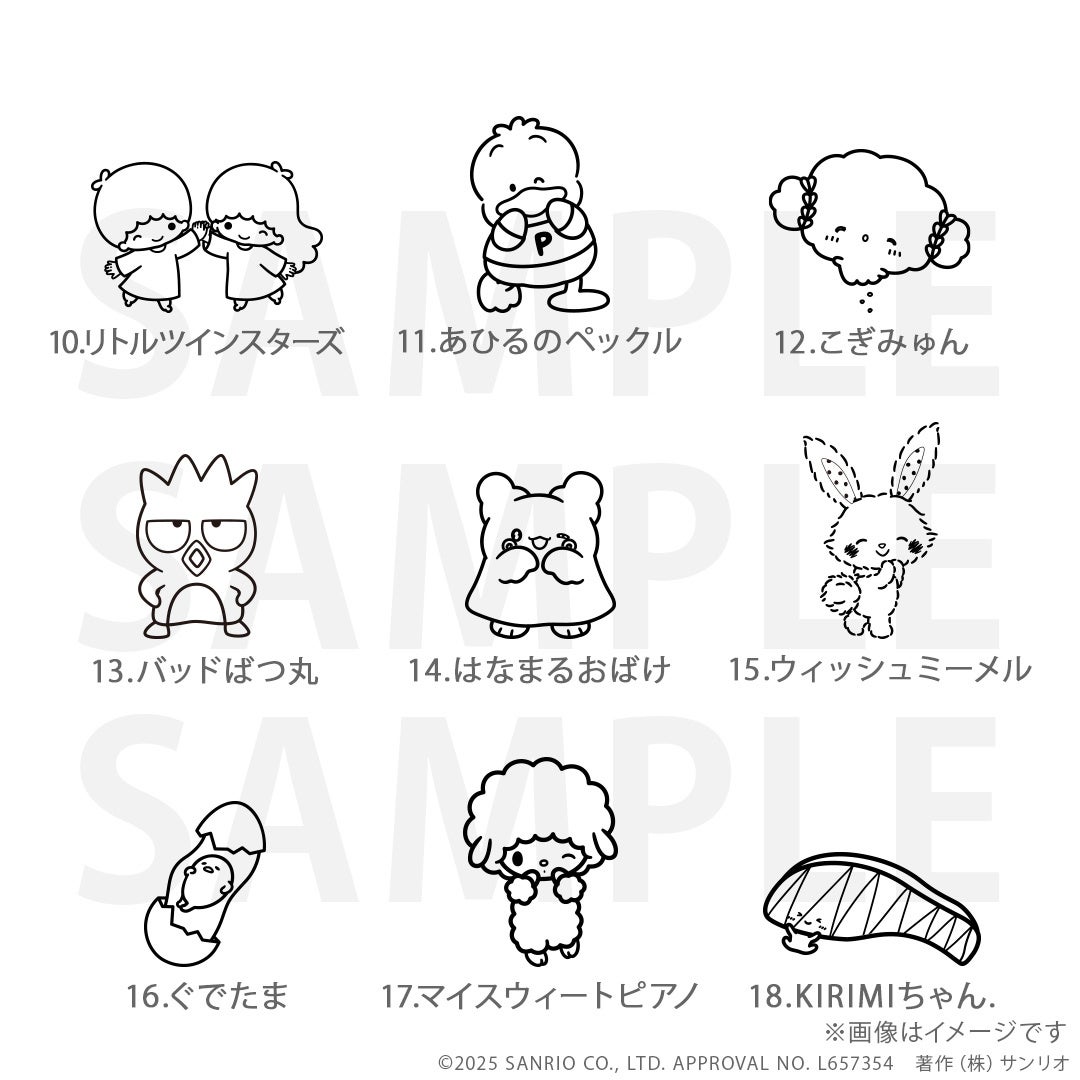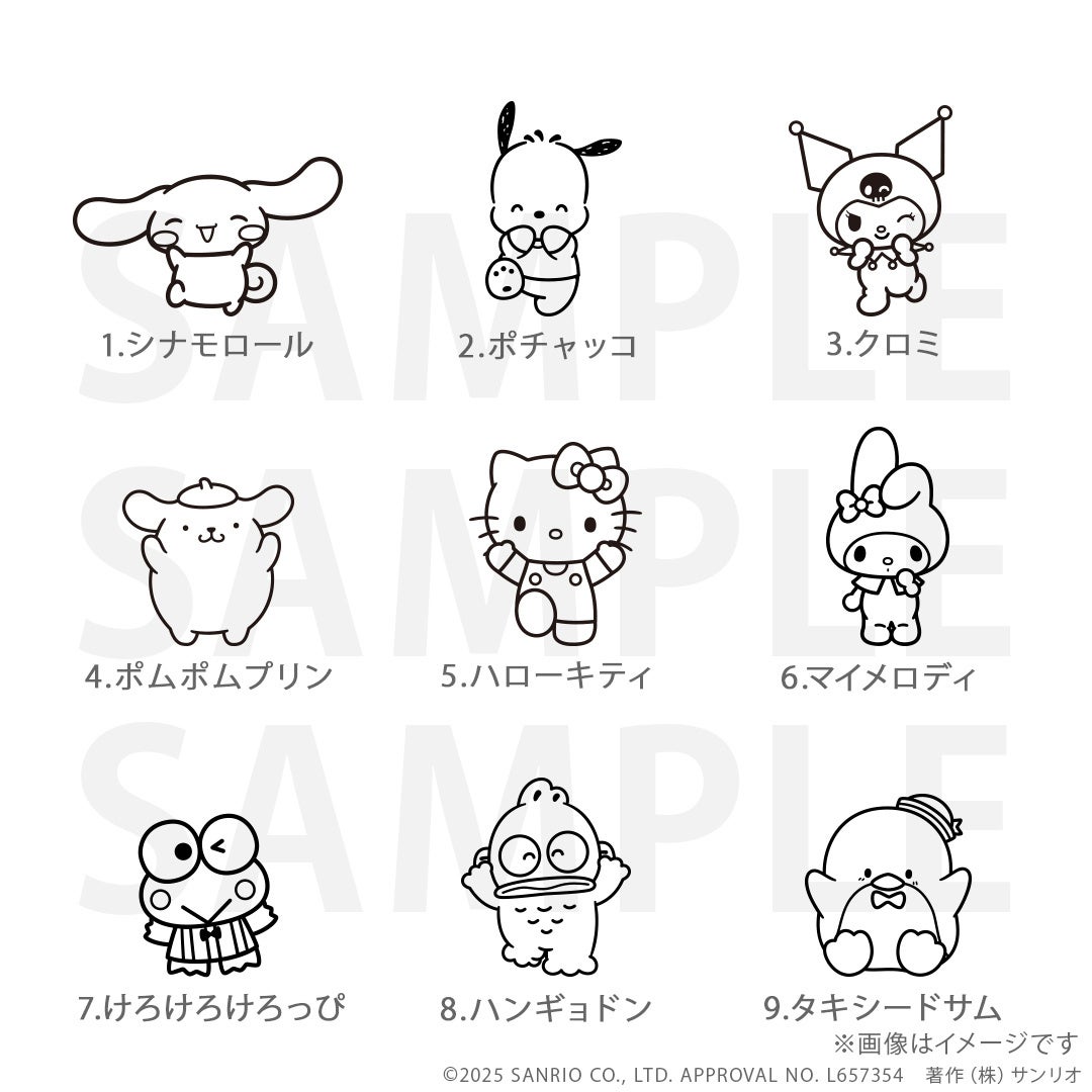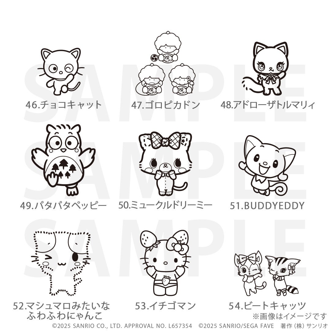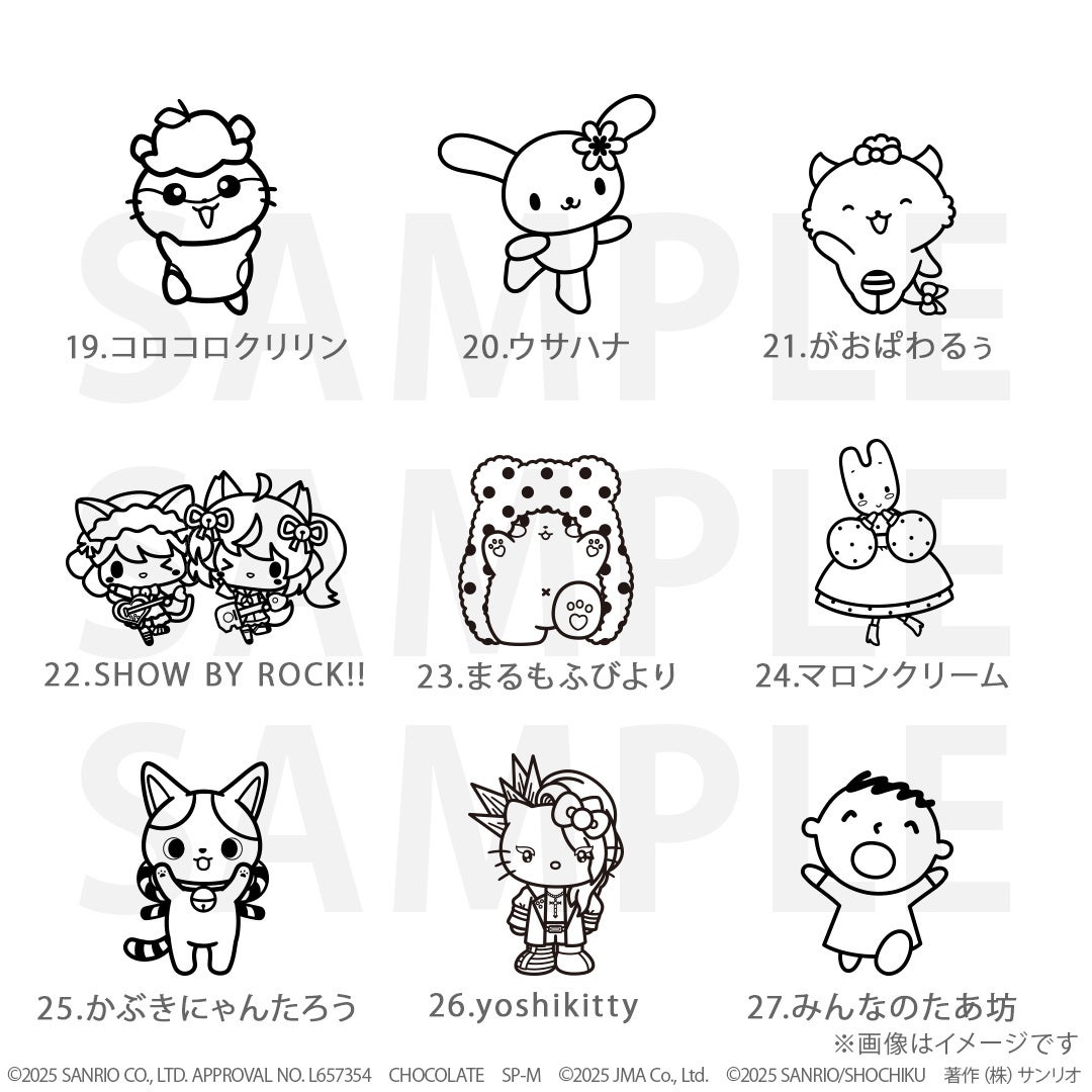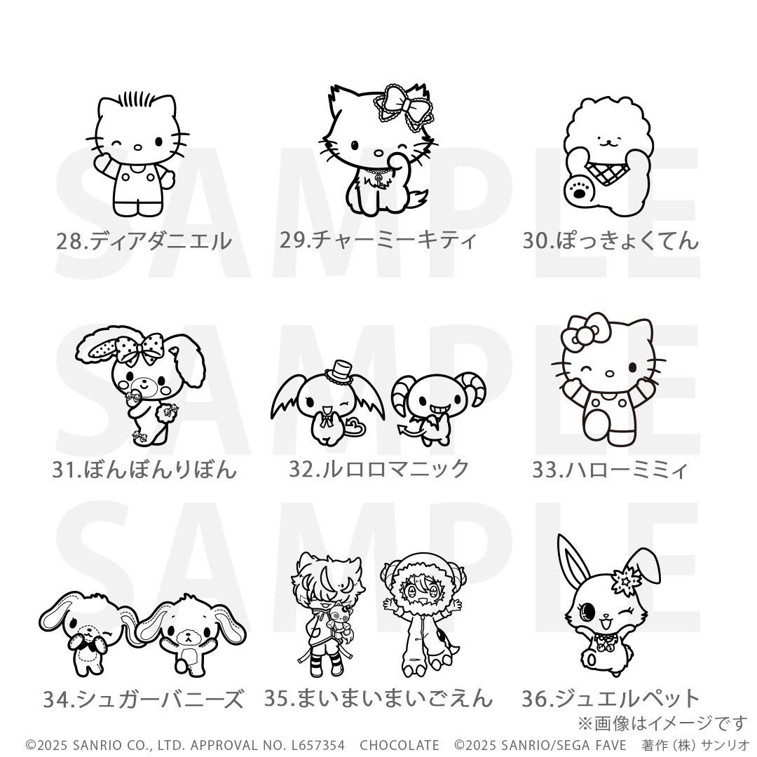 ナモロール、ポチャッコ、クロミ、ポムポムプリン、ハローキティ、マイメロディ、けろけろけろっぴ、ハンギョドン、タキシードサム、リトルツインスターズ、あひるのペックル、こぎみゅん、バッドばつ丸、はなまるおばけ、ウィッシュミーメル、ぐでたま、マイスウィートピアノ、KIRIMIちゃん.、コロコロクリリン、ウサハナ、がおぱわるぅ、SHOW BY ROCK!!、まるもふびより、マロンクリーム、かぶきにゃんたろう、yoshikitty、みんなのたあ坊、ディアダニエル、チャーミーキティ、ぽっきょくてん、ぼんぼんりぼん、ルロロマニック、ハローミミィ、シュガーバニーズ、まいまいまいごえん、ジュエルペット、ぺたぺたみにりあん、ニャニィニュニェニョン、リトルフォレストフェロォ、タイニーチャム、チアリーチャム、パティ&ジミー、おさるのもんきち、歯ぐるまんすたいる、アグレッシブ烈子、チョコキャット、ゴロピカドン、アドローザトルマリィ、パタパタペッピー、ミュークルドリーミー、BUDDYEDDY、マシュマロみたいなふわふわにゃんこ、イチゴマン、ビートキャッツ、かしわんこもち、パウピポ、フレッシュパンチ、リルリルフェアリル、いちごの王さま、ザシキブタ、ハミングミント、カリバディクス、ぱんくんち、ウメ屋雑貨店、ぽこぽん日記、ノラネコランド、クマミレン、くすりの福太郎、シュガーメヌエット、ぼさにまる、ザ ボードビルデュオ、るるる学園、ウィアーダイナソアーズ!、メローチューン、シンカイゾク、ウィンキーピンキー、たらいぐまのらんどりー、ザ ラナバウツ、てのりくま、バニー&マッティ、ニョッキ&ペンネ、プワワ、セブンシリードワーフ、タイニーポエム、パンナピッタ、リスル、スポーティングベアーズ、チェリーナチェリーネ、パンダップル、スウィートコロン