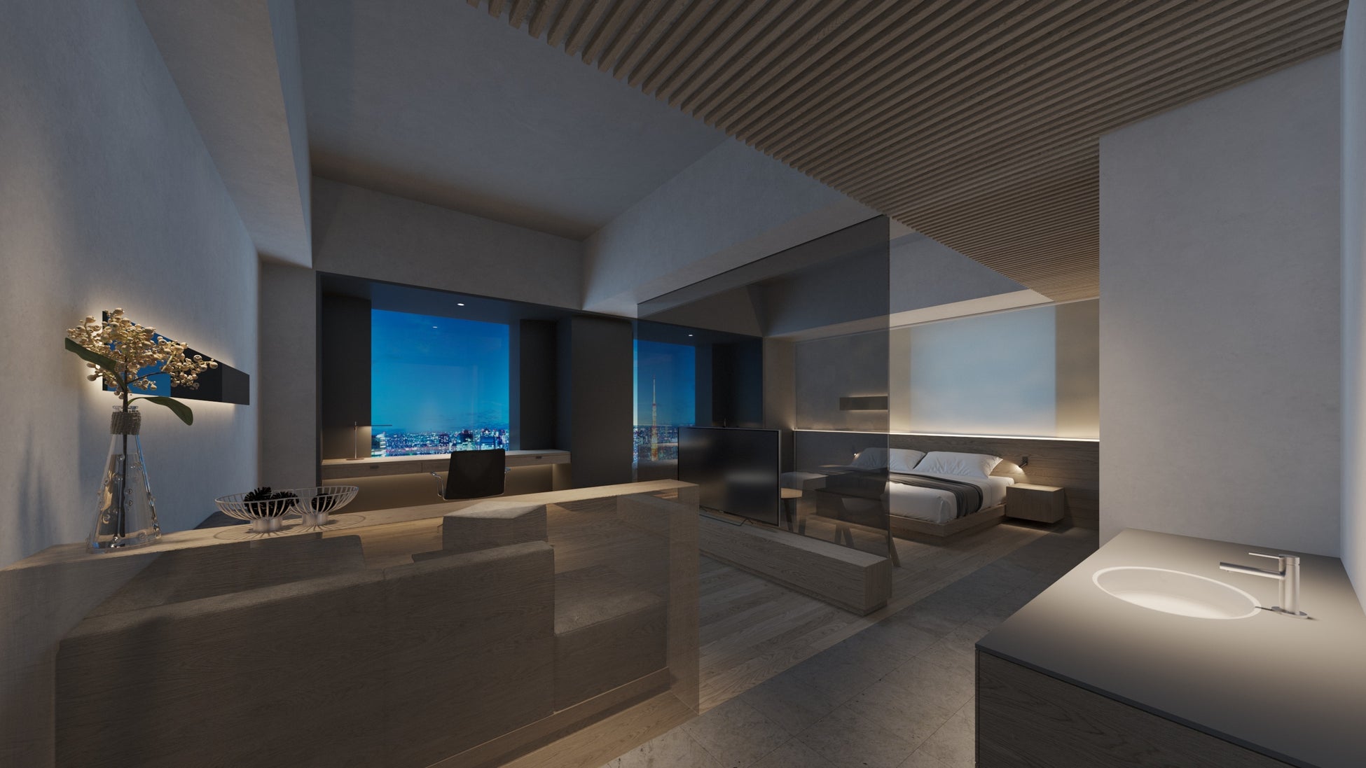 ・客室リニューアルデザインのコンセプトは「プリズム&リフレクション」。摩天楼の夜景に煌めく客室からの光景を捉え、夜景の中で一日を終えるイメージを客室デザインに取り入れます。眺望を遮ることがないように一部の間仕切りにはガラスを採用。