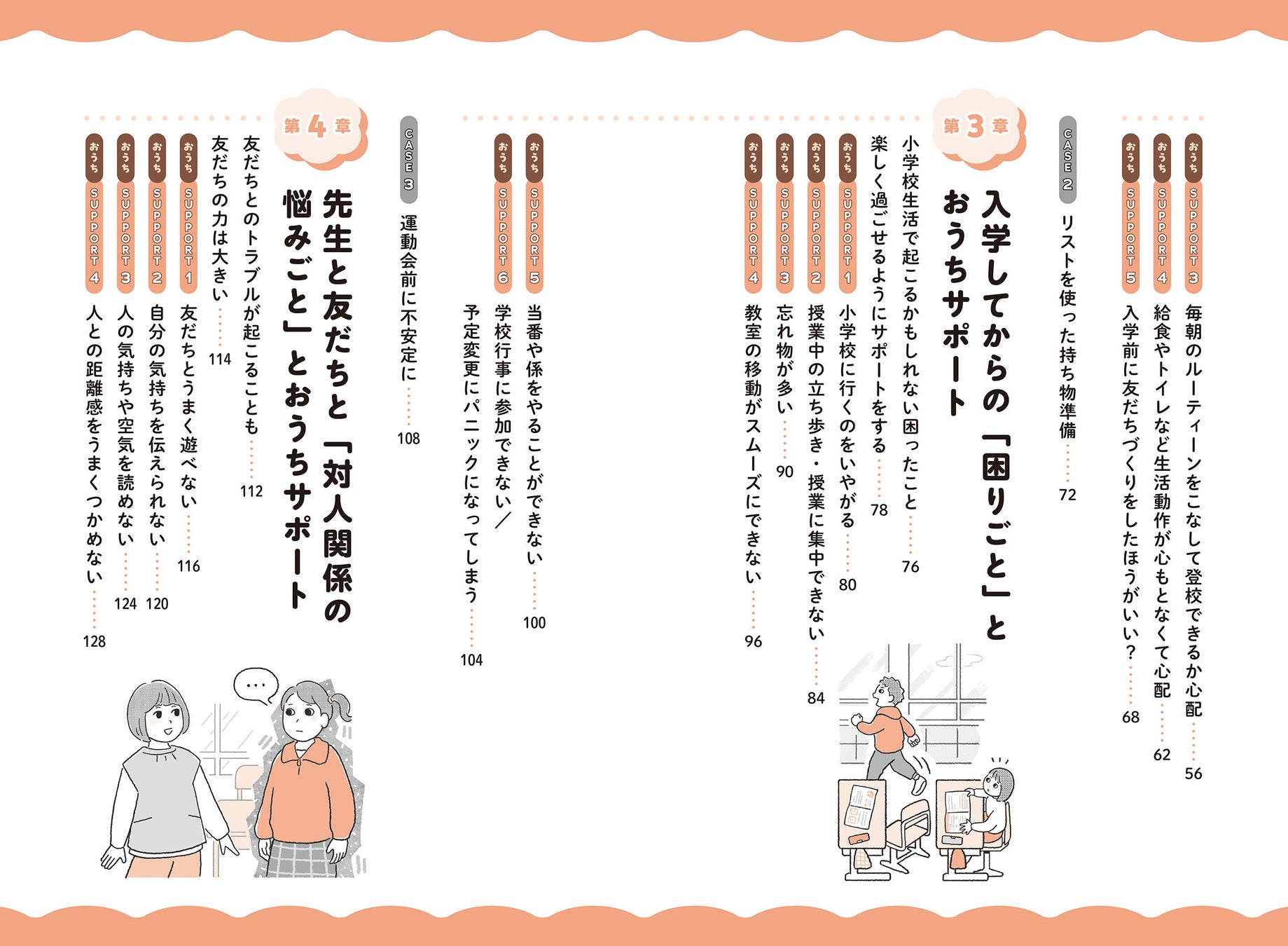 就学準備から小学校6年間で遭遇しがちな、生活動作、授業態度、コミュニケーションや人間関係、学習面などの①「困りごと」②「考えられる背景」③「おうちでできるサポート」をセットで解説。