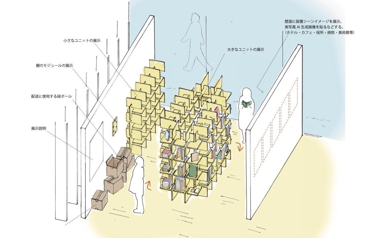 書籍と一緒に組み立て式の書棚が届く「ポータブル書店」のコンセプト什器を展示します。すぐに書店が開業できるパッケージ型サービスのプロトタイプです。