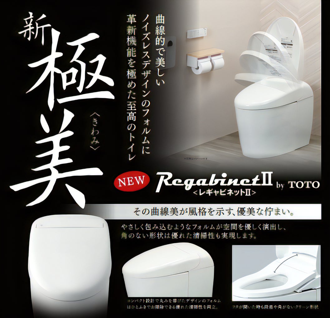 「レギャビネットⅡ」は、前回モデルに続きTOTO株式会社とのコラボ企画商品で、曲線的で美しいノイズレスデザインのフォルムに、オート開閉やオート洗浄機能をはじめ、オートノズル除菌やオートクリーンミストなどの革新的機能を極めた至高のトイレです。
