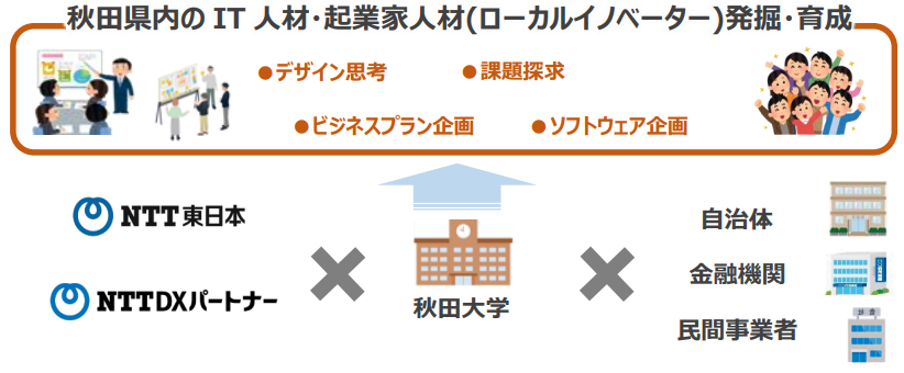 秋田大学、NTT東日本 秋田支店、およびNTT DXパートナーは、地域独自のIT・起業家人材(ローカルイノベーター)を発掘・育成することが地域の価値創造に貢献できると考え、秋田県内の優れたアイデア・技術を持つ若手人材に対して、地域課題・起業に対する理解を深め、課題探求を実践し、ビジネスプランを企画する「秋田 若手人材発掘・育成イノベーションプログラム」を企画・運営いたします。