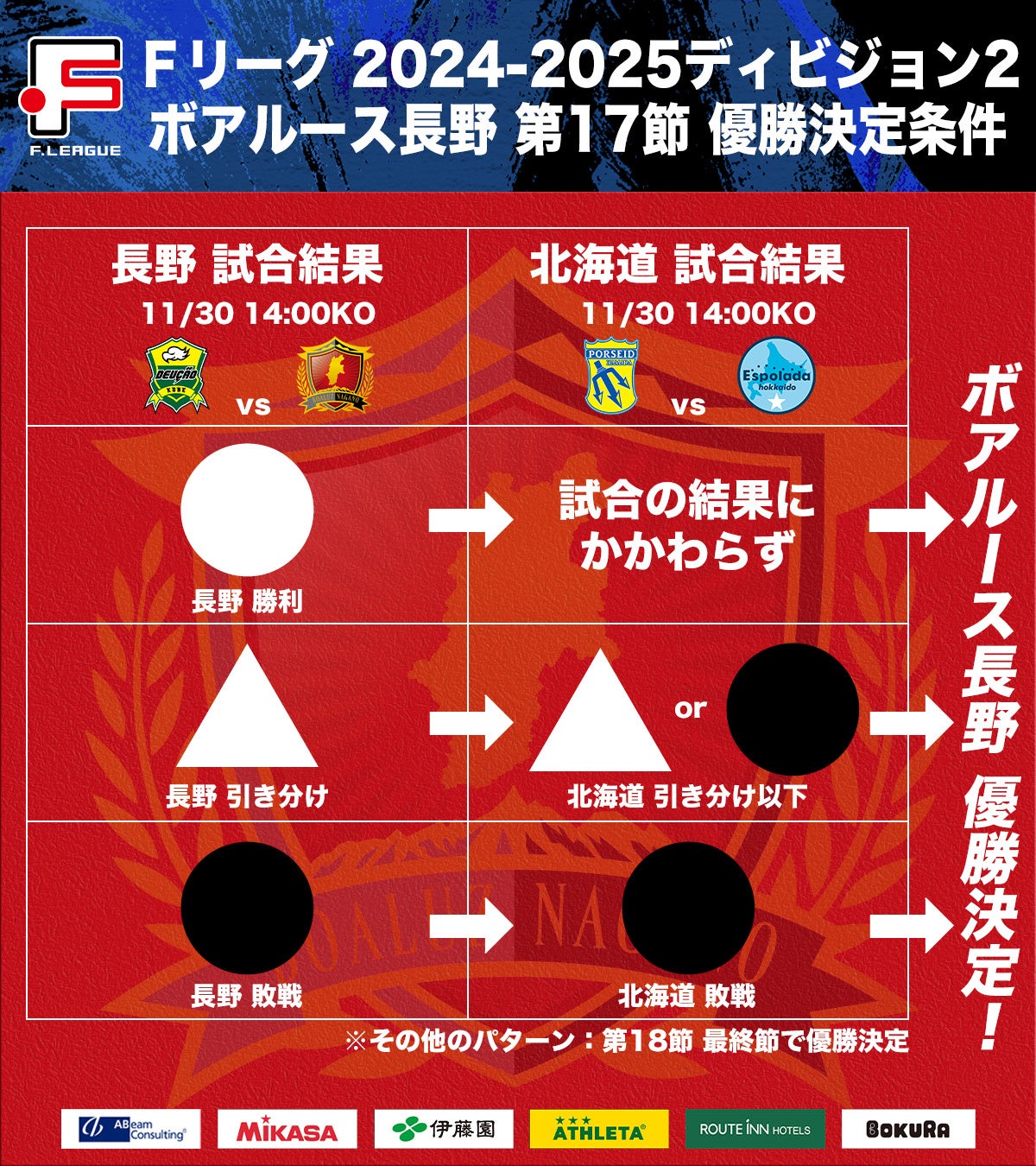 Fリーグ2024-2025 ディビジョン2 第17節にて、首位・ボアルース長野が優勝を決定する条件を紹介いたします。