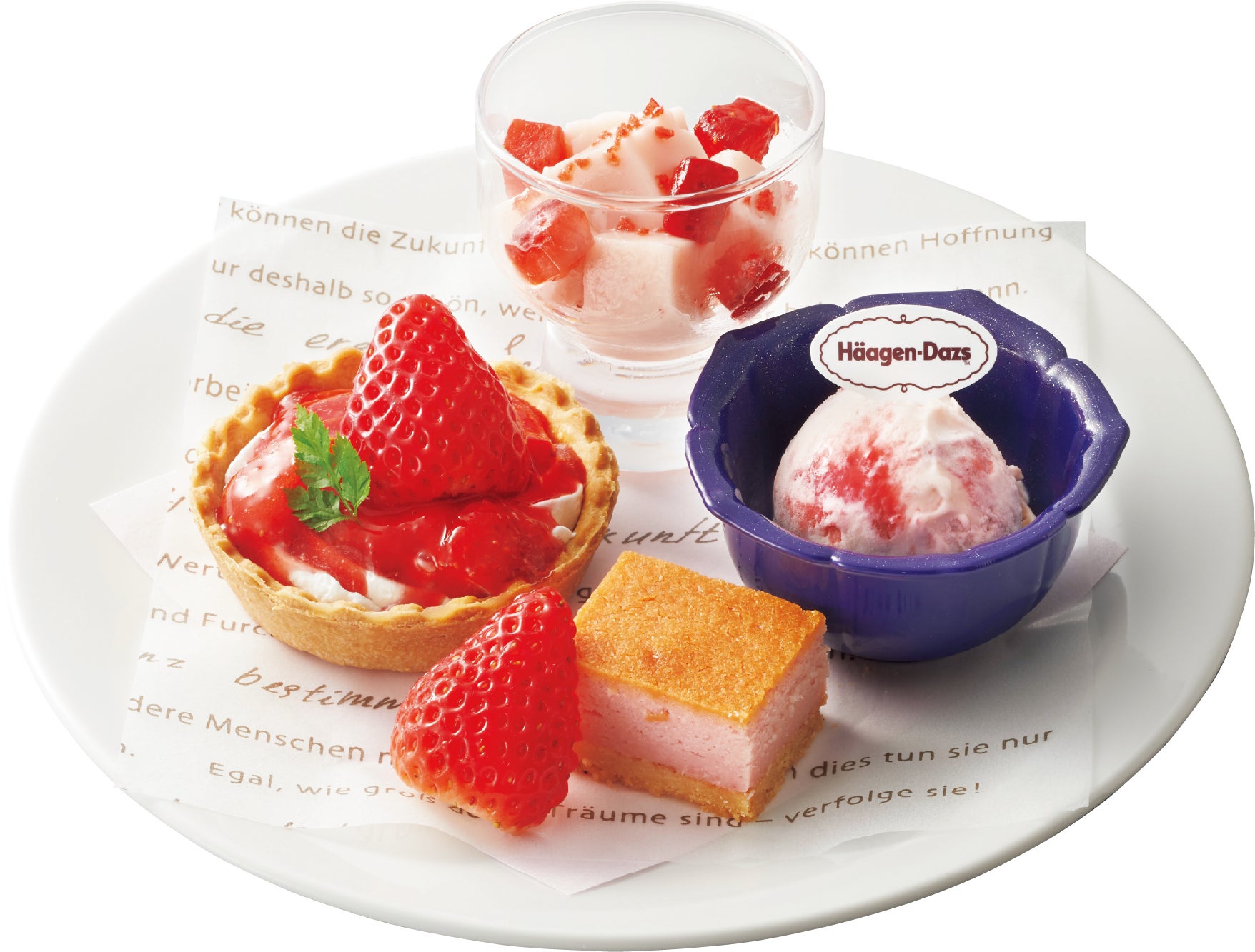 パイタルト、パンナコッタ、ハーゲンダッツいちごアイスといちごチーズケーキを一度に楽しめるアソート。色々な食感と甘みが少しずつ味わえるひと皿です。