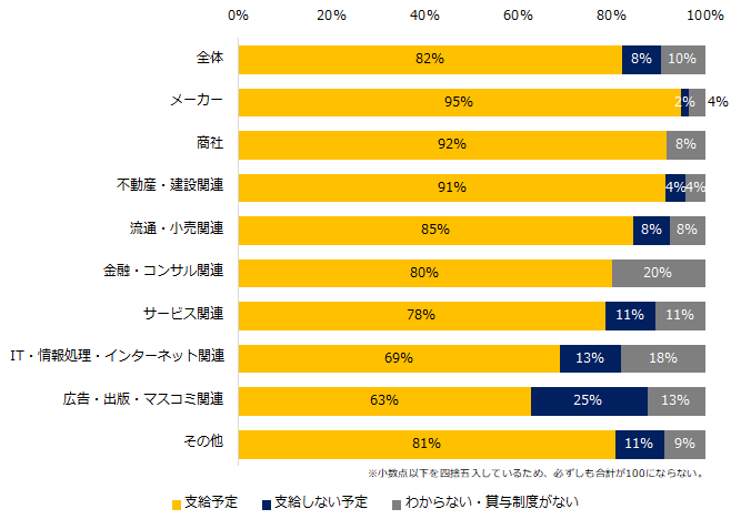 「2023年、冬季賞与は支給予定ですか?」と伺うと、82%の企業が「支給予定」と回答。昨年から変化はありませんでした。