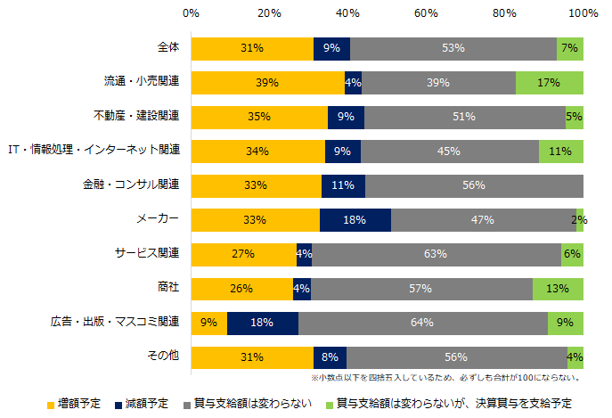 【図4】2023年冬季賞与を「支給予定」と回答した企業に伺います。昨年の冬季賞与と比較し、支給額に変動はありますか?(業種別)