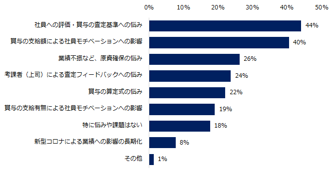 社員への賞与支給に関する悩みや課題を伺うと、上位は「社員への評価・賞与の査定基準への悩み」(44%)、「賞与の支給額による社員モチベーションへの影響」(40%)でした。具体的な理由もご紹介します。