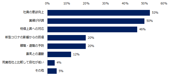 増額予定の企業に理由を伺うと、トップ3は「社員の意欲向上」(53%)、「業績が好調」(50%)、「物価上昇への対応」(46%)でした。一方で減額予定の企業の理由は「業績不振」(71%)が最多でした。