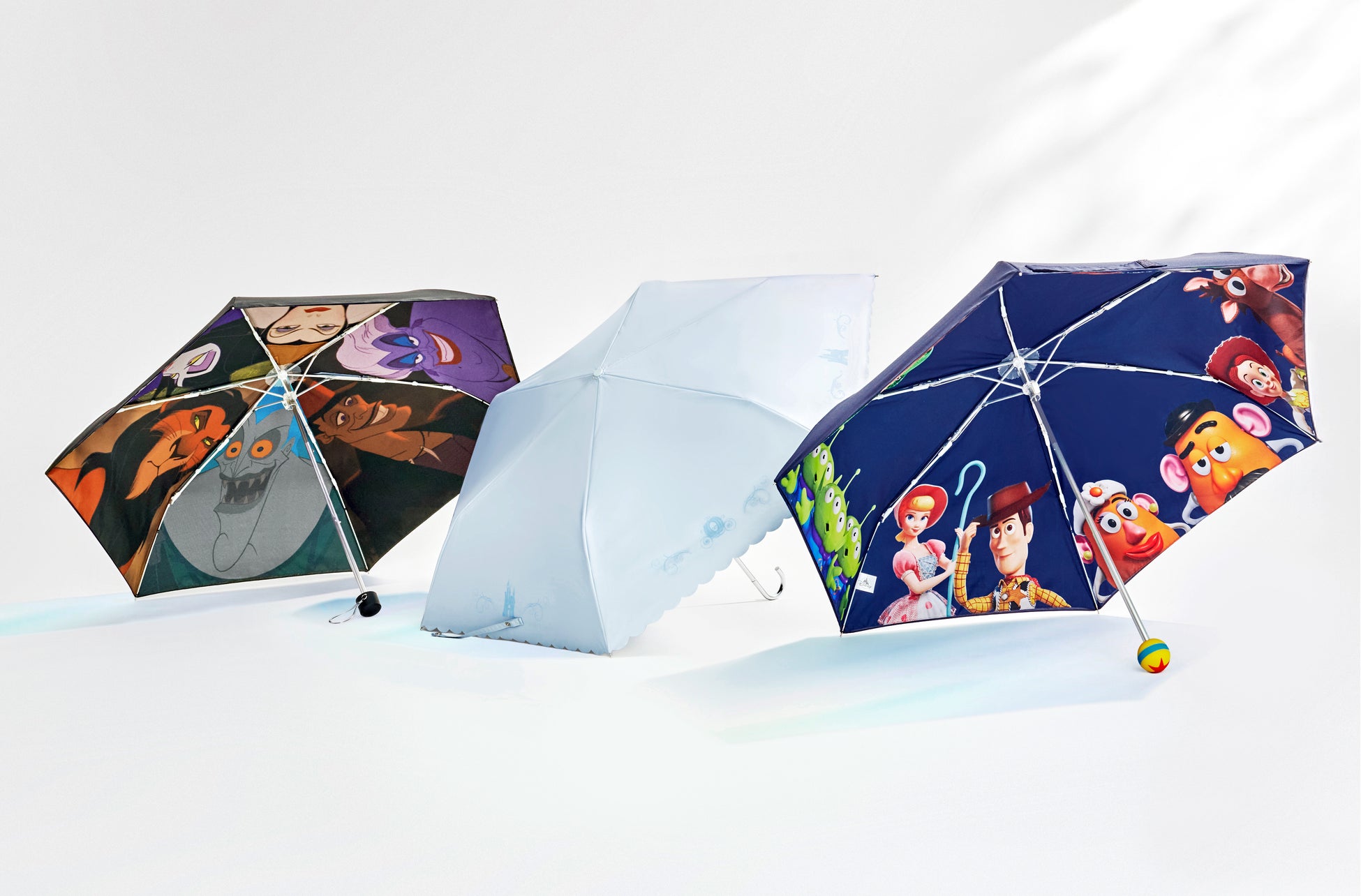 外側はシンプルながら、開くと内側にキャラクターアートが広がる折りたたみ傘が今年も登場。見上げるたびにキャラクターと一緒におでかけしているような気分を楽しめます。ミッキーマウス、グーフィー、アリエル、ディズニーヴィランズなどのアートや、持ち手のピクサー・ボールのモチーフが心くすぐる「トイ・ストーリー」デザインが登場します。また、キャラクターフェイスデザインのポーチ付き傘は、ドナルドダックとルシファーデザインを展開。そのほか、キャラクターのワンポイントが映える傘や、ハートのカラビナ付きで上品な色合いの傘など、コーディネートやシーンに合わせて選べる豊富なバリエーションをご用意しました。