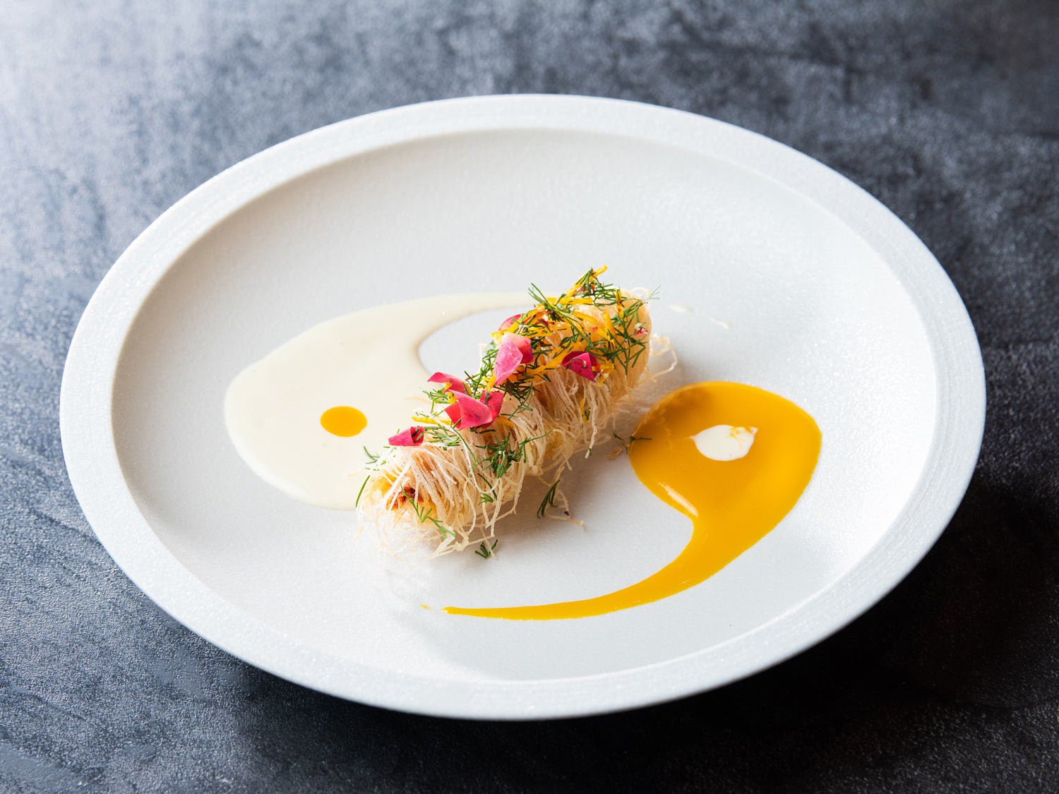 レモングラスでコンフィしたオマール海老にカダイフを巻きつけて