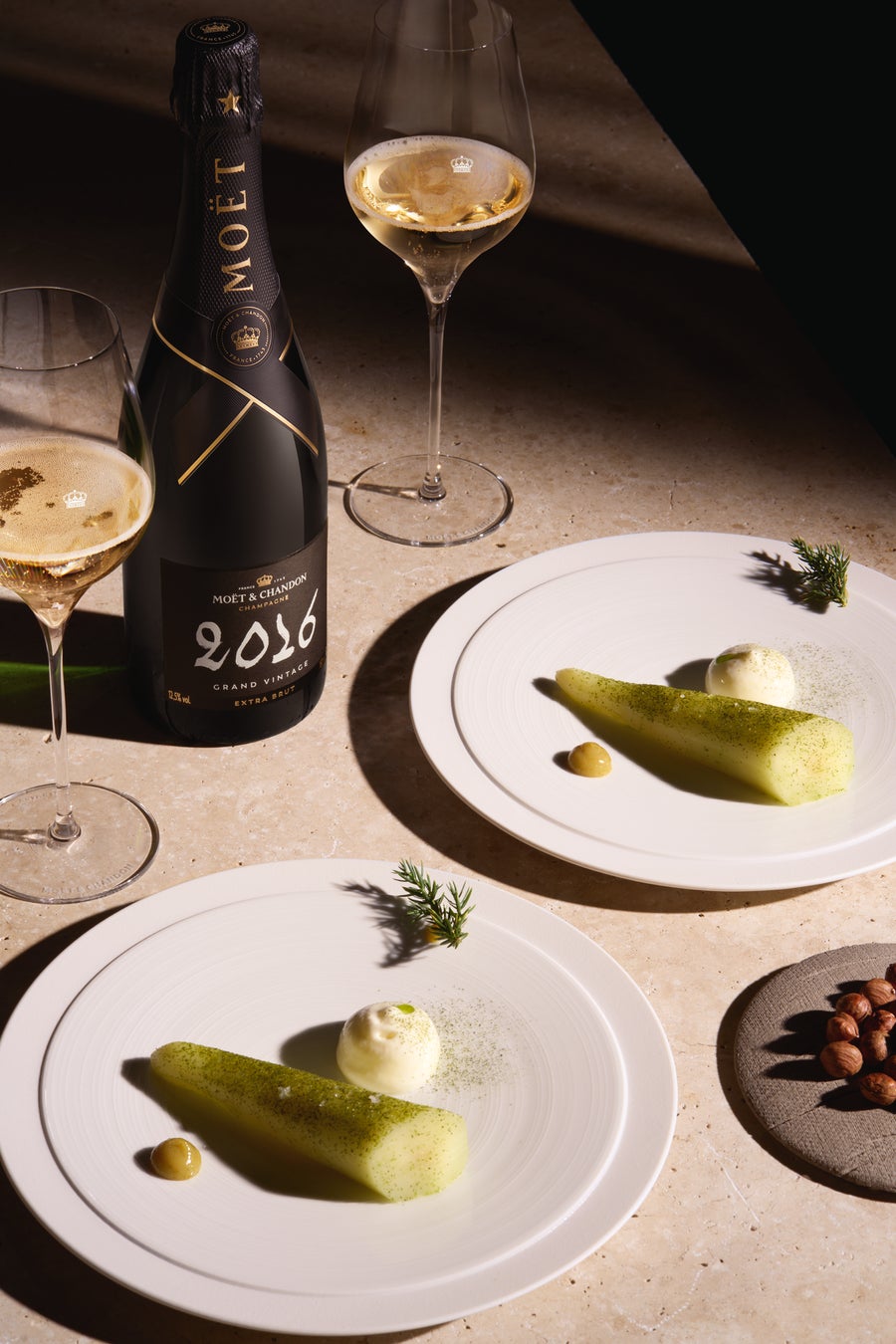 「モエ・エ・シャンドン グラン ヴィンテージ 2016」と最も相性がよいのは、柔らかくとろけるようなジビエ、もしくは肉や魚に少量の果汁を煮詰めたソースを添えた料理です。例えば、フェンネルで仕上げたコンフィのような柔らかい料理の淡白でニュートラルな味わいは、このシャンパンの味わいを最大限に引き出してくれます。さらに、アニスシードを少々加えれば、グラン ヴィンテージが持つ白い果実とフローラルな香りをさらに引き立ててくれます。