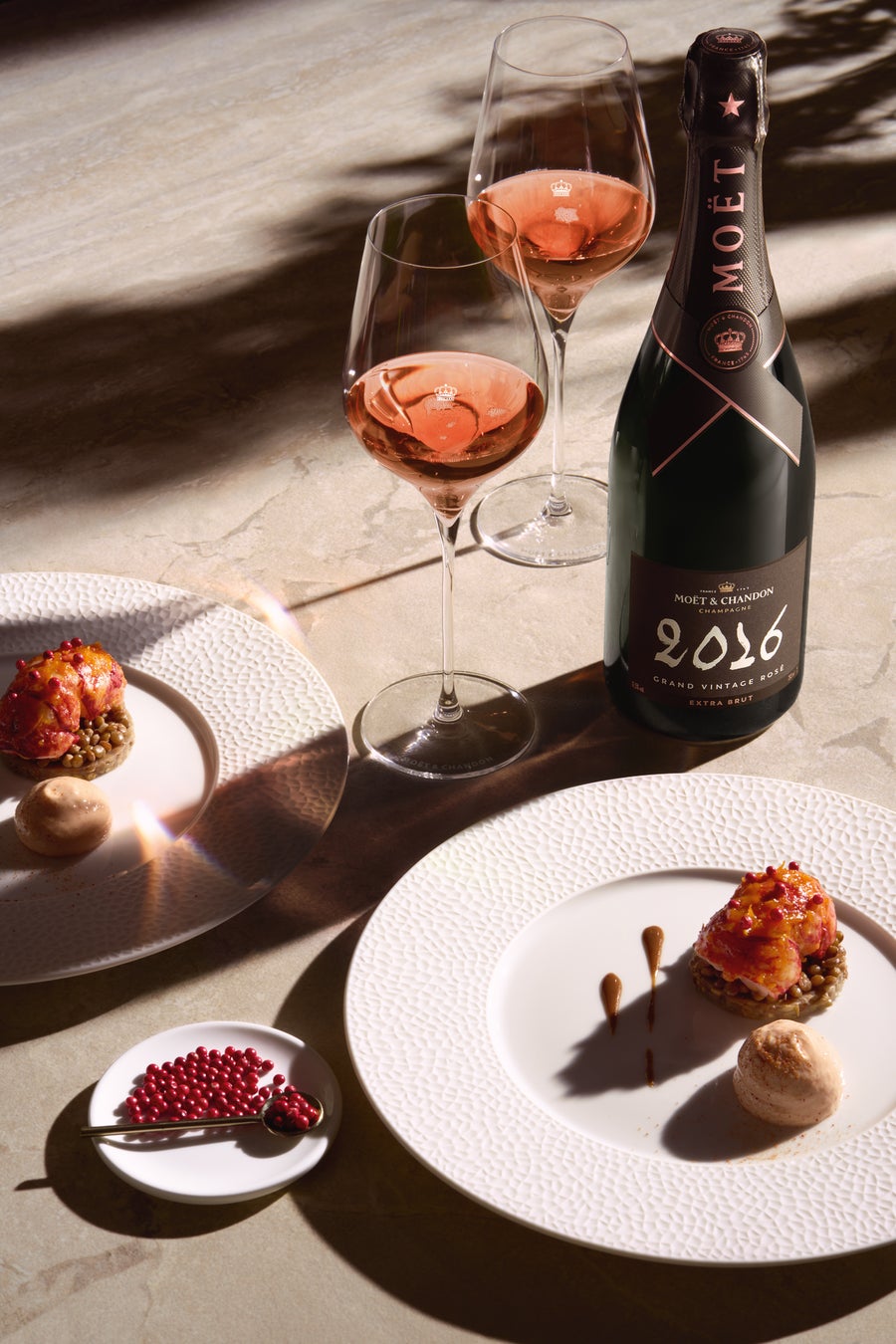 「モエ・エ・シャンドン グラン ヴィンテージ ロゼ 2016」は、ジビエやロブスターなど、テクスチャーの似た料理と絶妙にマッチします。これらの料理は、シャンパンのミネラル感を引き立て、ピンクベリーや柑橘系の爽やかな香りを加えることで、より一層魅力的な味わいを楽しめます。さらに、スパイスの香りを加えると、印象的なコントラストが生まれます。このペアリングには、シルクのような軽やかさとほのかなピンク色を感じる料理がぴったりです。