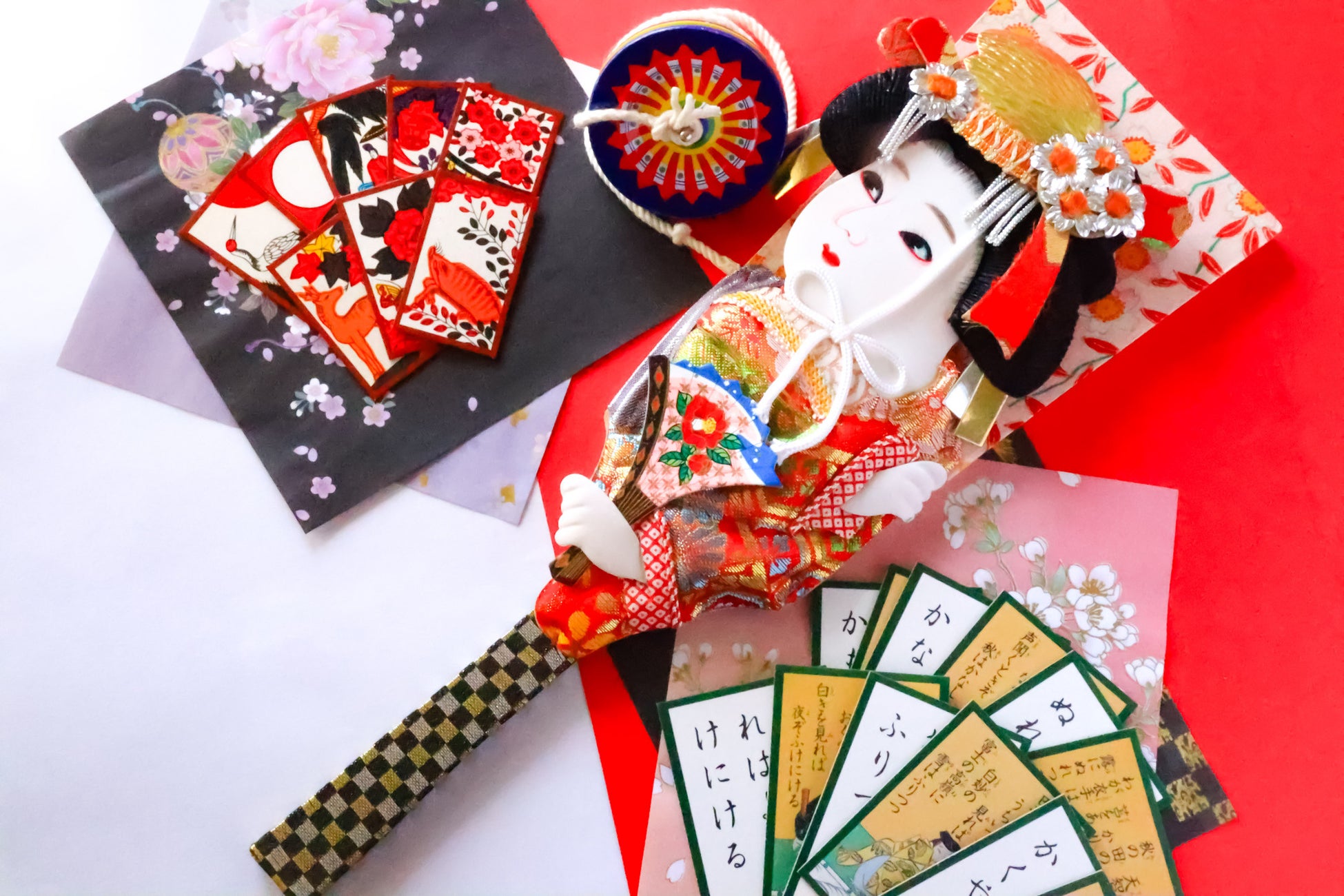 福笑い・けん玉・花札・コマ・紙風船・羽子板・めんこなど、世代を問わず楽しめるあそびが勢ぞろい。