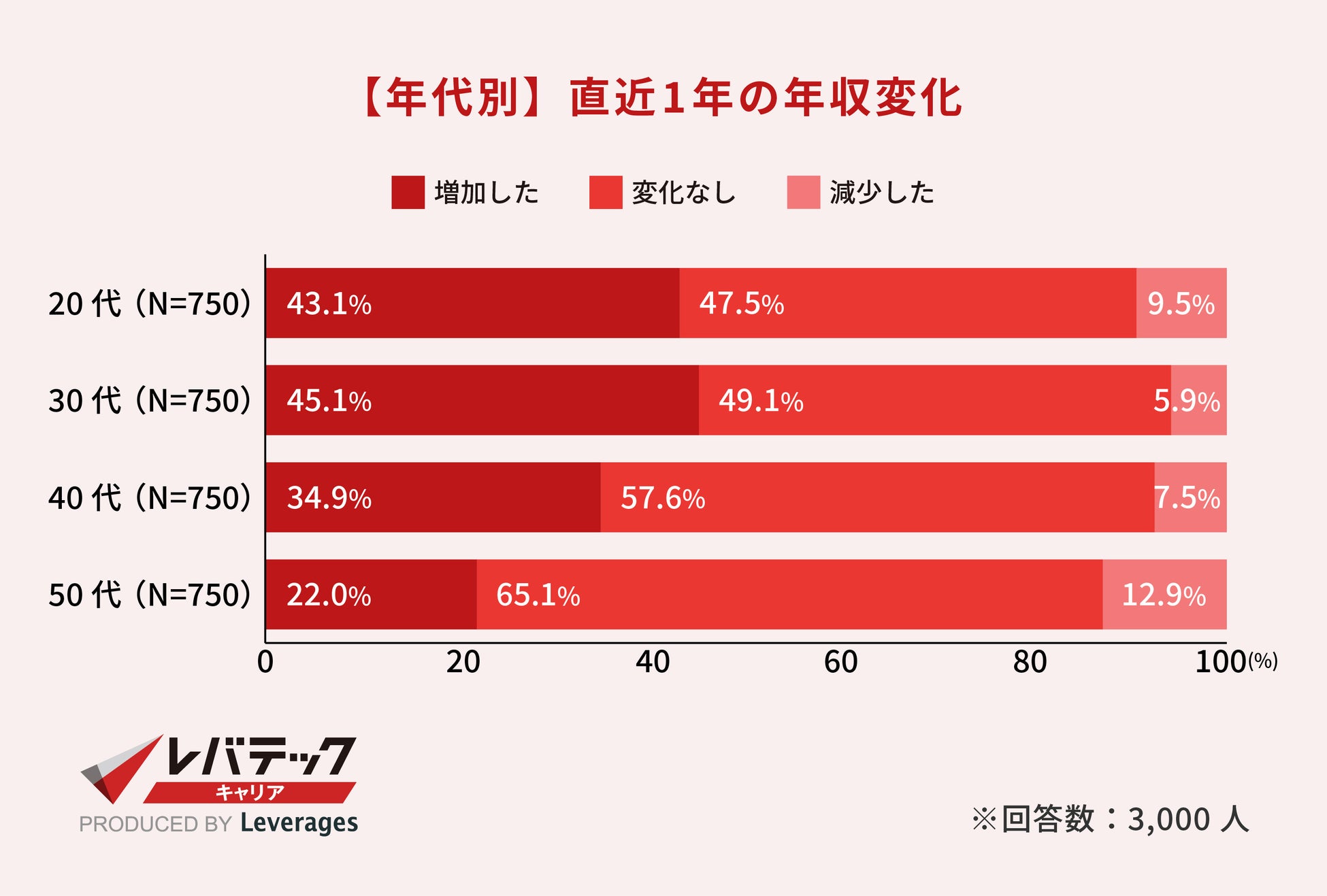 年代別に見ると、年収が「増加した」と回答したのは、20代で43.1%、30代で45.1%と、いずれも4割を超えました。一方で、50代で年収が「増加した」と回答した人は2割にとどまり、他の年代に比べて割合が低い傾向が見られました。
