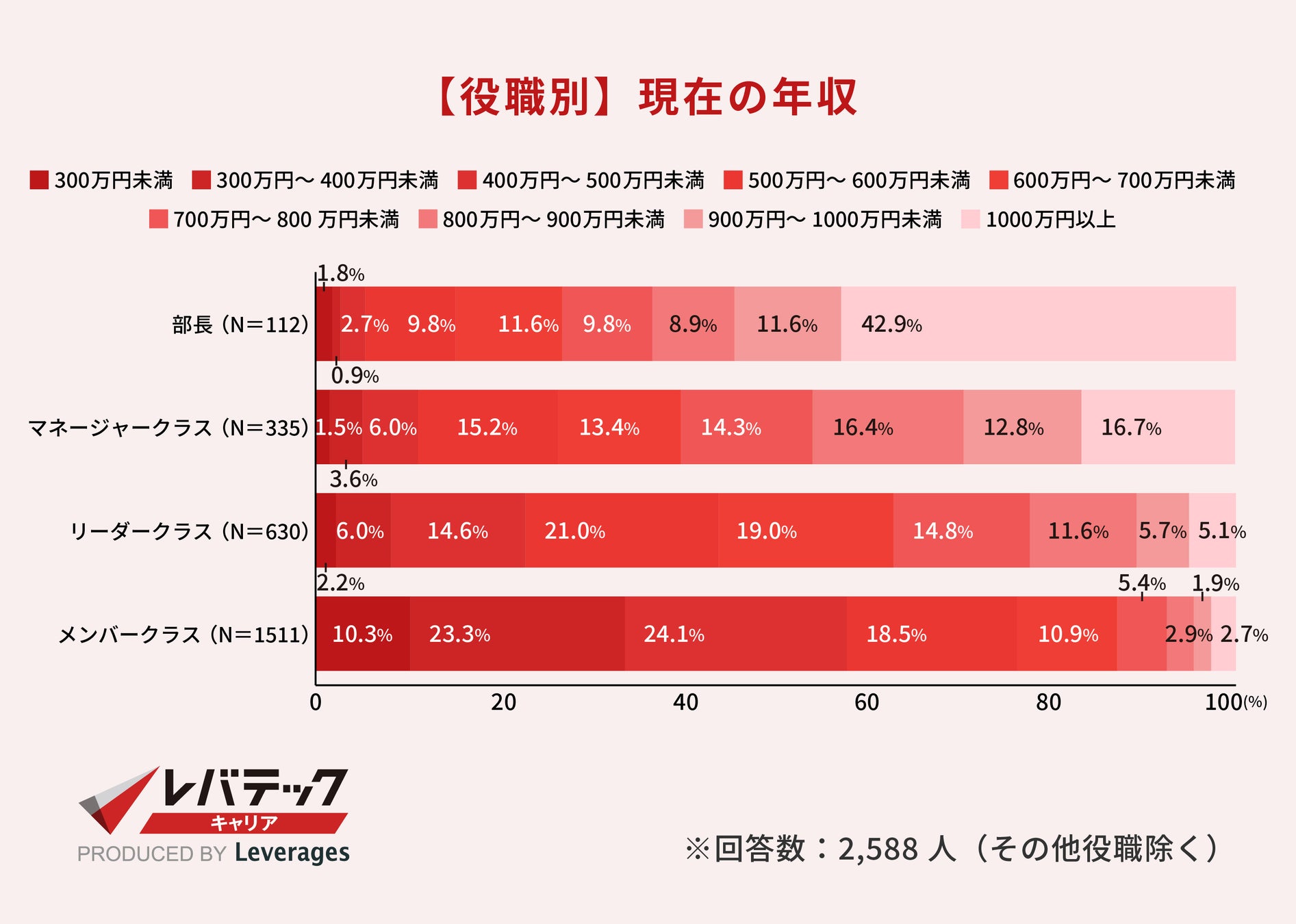 役職別に見ると、部長・マネージャークラスでは「年収1,000万円以上」の割合が最も多く、リーダークラスでは「500万円~600万円未満」が最多となりました。一方で、メンバークラスでは「500万円未満」の年収帯が過半数を占める結果となり、役職による年収差が見られます。