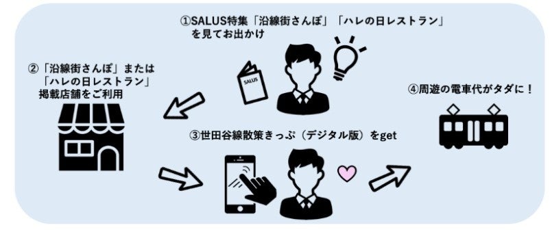 今般、第3弾として、東急線沿線のフリーペーパー「SALUS(サルース)」(東急株式会社発行)11月号に掲載された山下・宮の坂エリアの対象店舗を利用した方に、世田谷線1日乗り放題デジタルチケット「世田谷線散策きっぷ」を無料で発行する取り組み(以下、本企画)を、10月20日から期間限定で実施します。