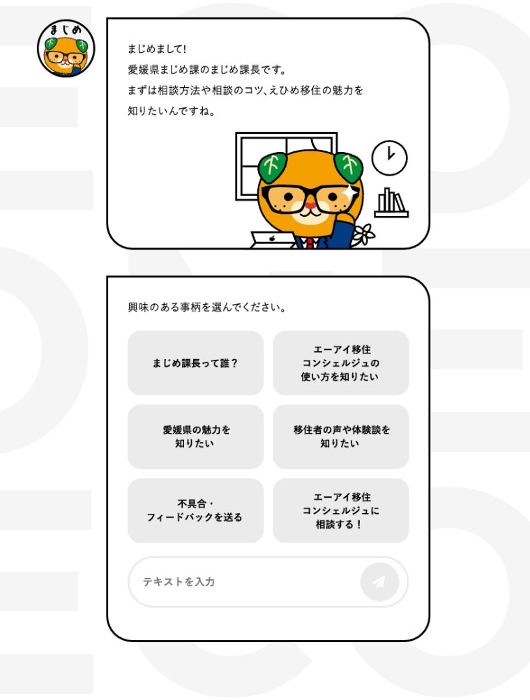 ユーザーの相談や質問に回答するのは、会話型AIとフュージョン(合体)した、愛媛県のイメージアップキャラクター・まじめ課長(みきゃん)。「エーアイ移住コンシェルジュ」となったまじめ課長が、柔軟で自然な対話を通じて、ユーザーを実際の移住相談や支援へと手引きします。