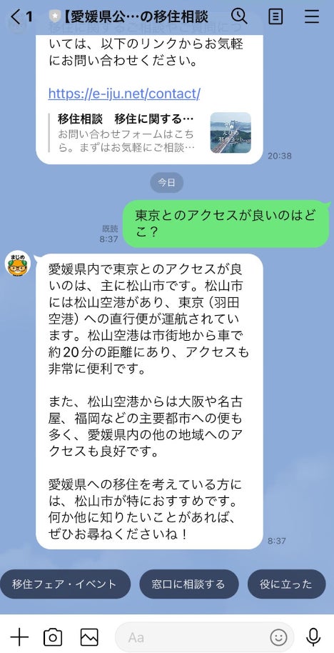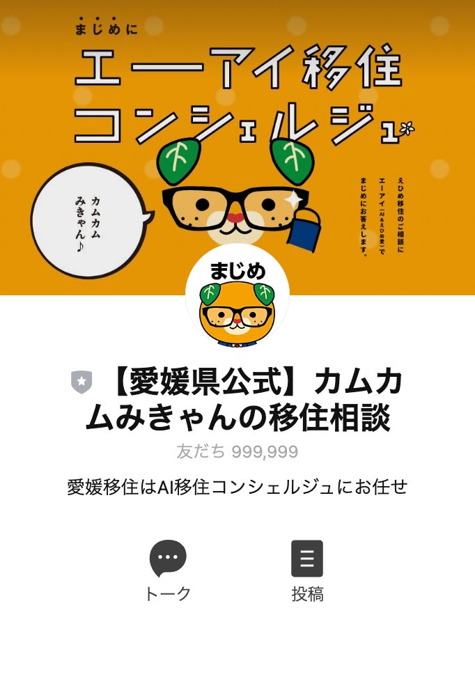 LINEで「【愛媛県公式】カムカムみきゃんの移住相談(エーアイ移住コンシェルジュ)」のアカウントを友だち追加いただくと、エーアイ移住コンシェルジュ・まじめ課長とLINEで会話をするように、24時間いつでも移住相談が可能です。