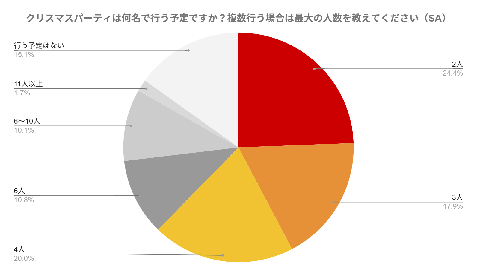 クリスマスパーティを行う人数は「2人」が約24%、「3人」が約17%、「4人」が約20%と、少人数でおこなう方が大多数