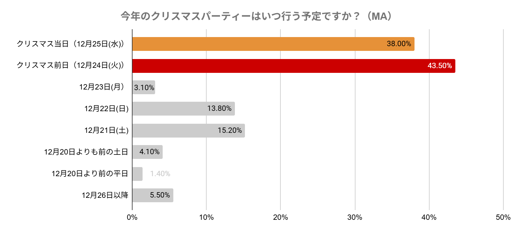 今年のクリスマスパーティは12月24日(火)に実施が約43%、12月25日(水)に実施が約38%と、平日に実施する人が大多数