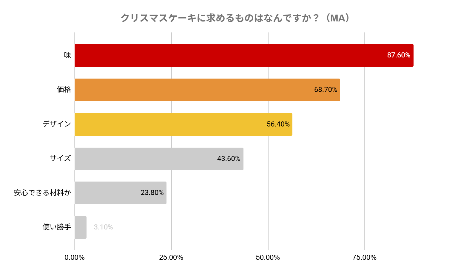 クリスマスケーキに求めるものは「味」約87%に次いで「価格」が約68%。「デザイン」よりも重視。