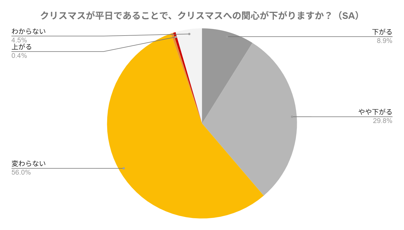 クリスマスが平日なことで関心は「変わらない」が半数以上。一方、約38%が「下がる」と回答